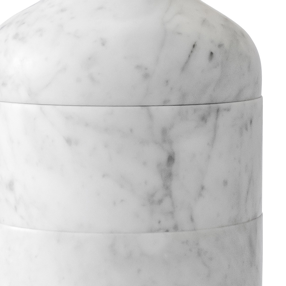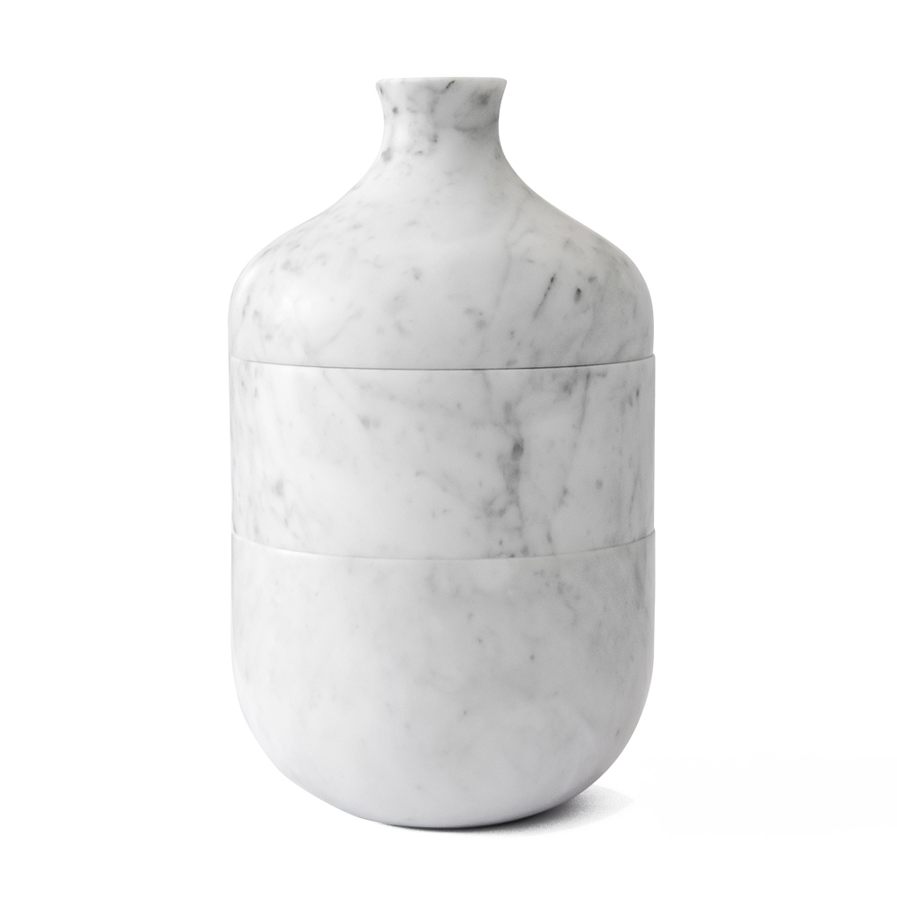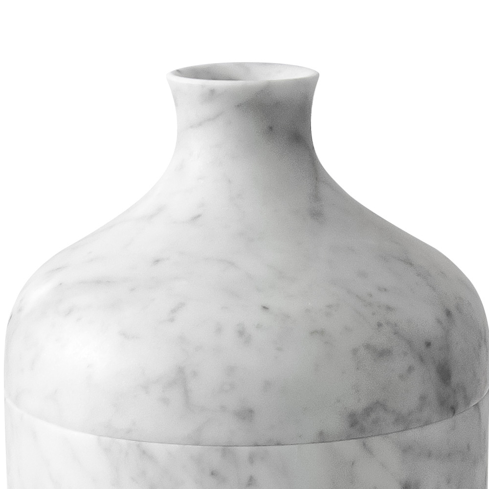 This decorative vase features an artisanal and luxurious design divided into 3 parts, entirely made of satin white Carrara marble.