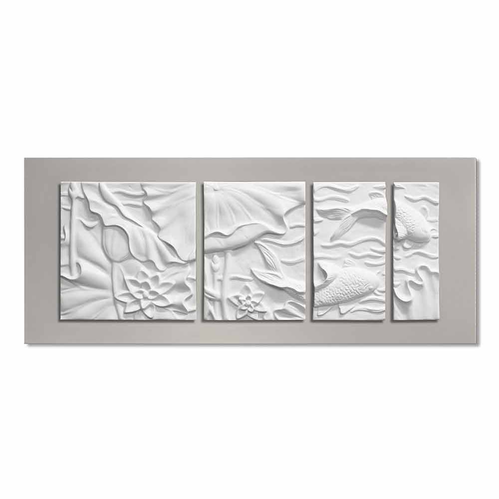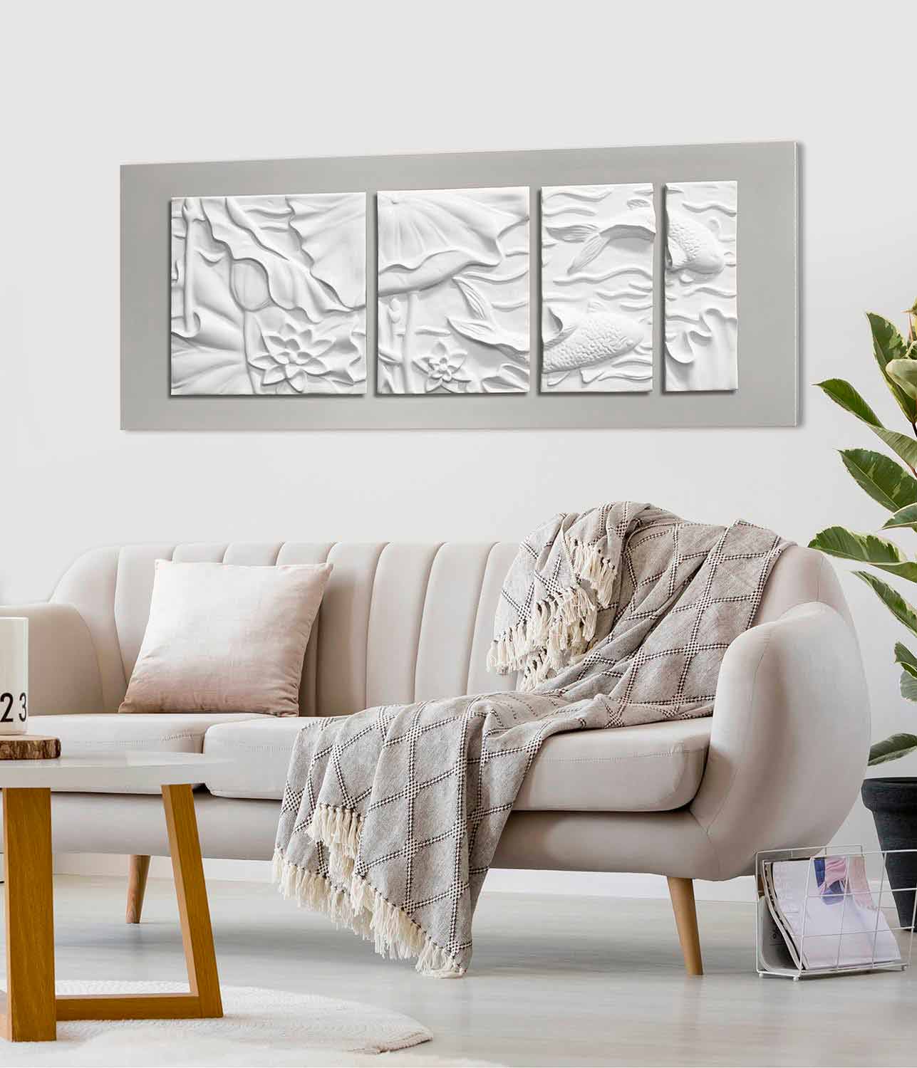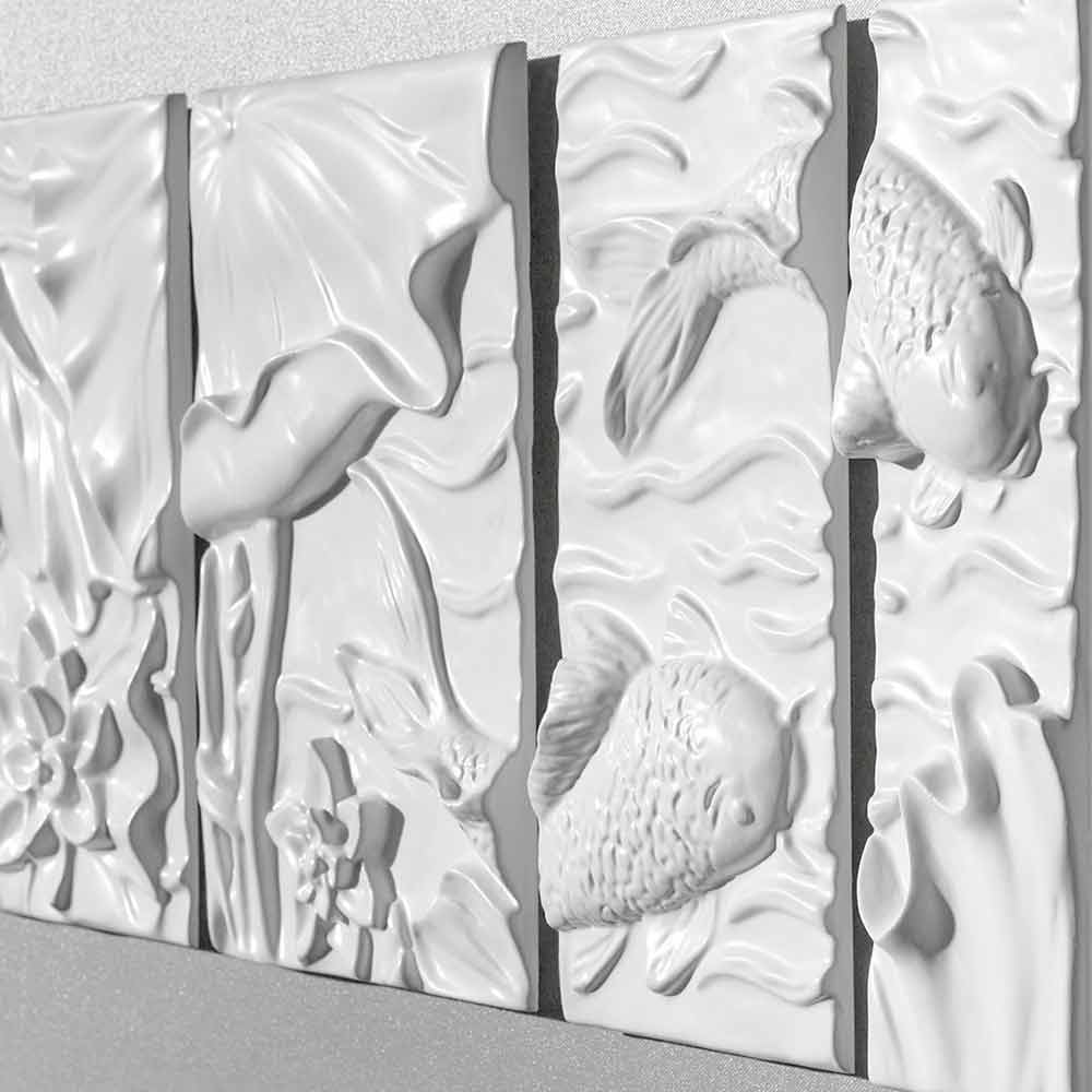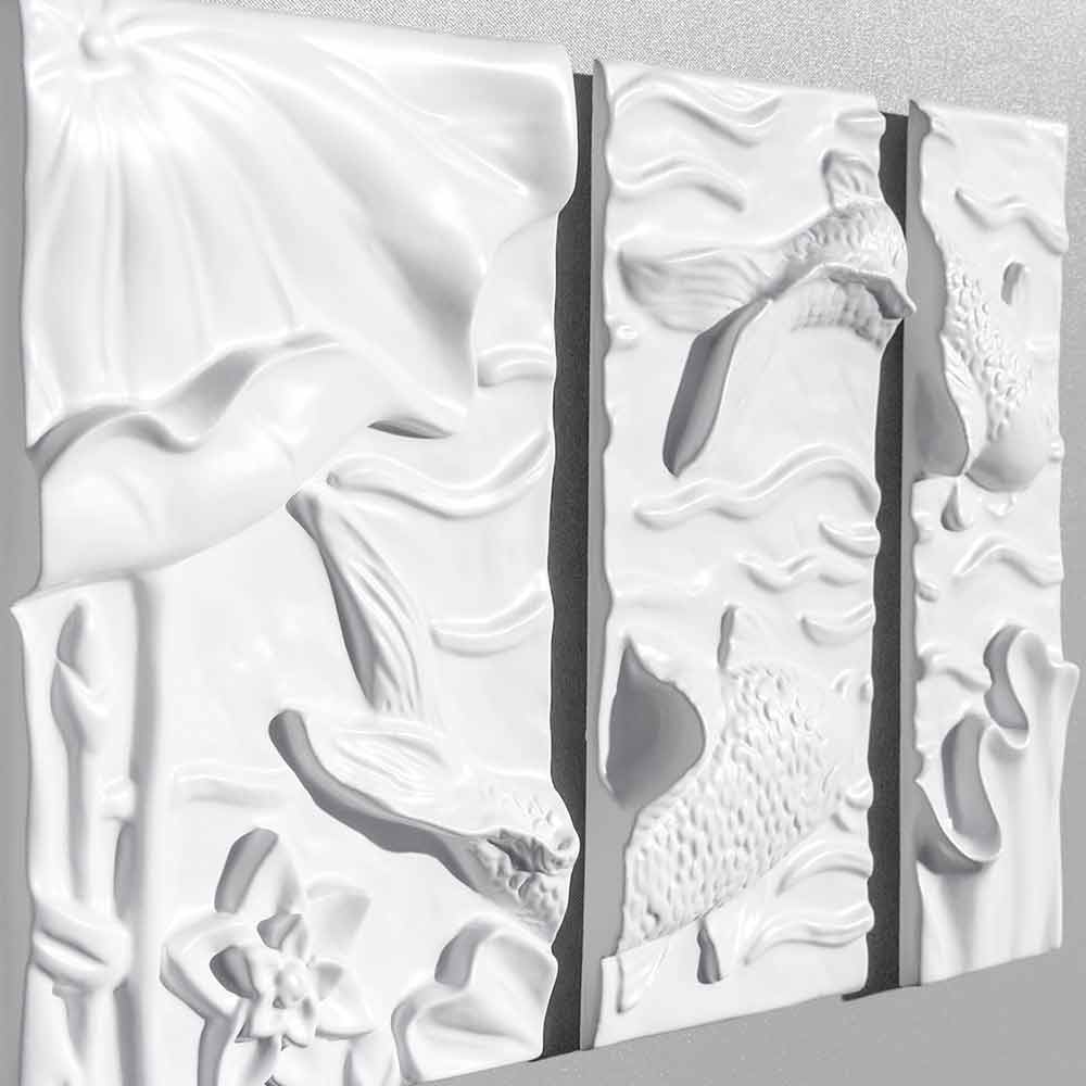 wall installation in composite ceramic is composed of four elements with elegant lines and modern shapes in ivory white depicting the Japanese koi carp mounted overhanging on silk gray lacquered canvas. The result is with a minimal and decorative aesthetic impact, for a unique style.