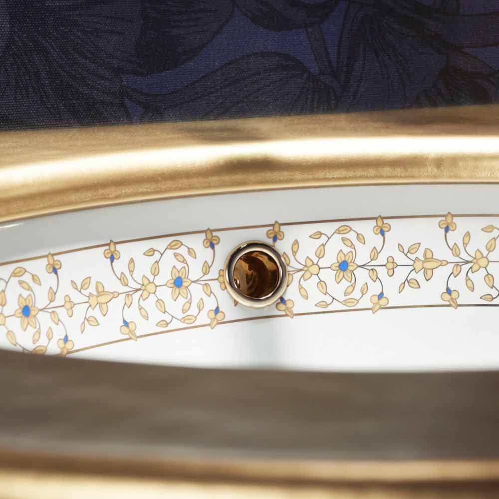 Built-in bathroom sink made in Italy in handmade fire clay with blue and 24 carat gold floral decoration band.