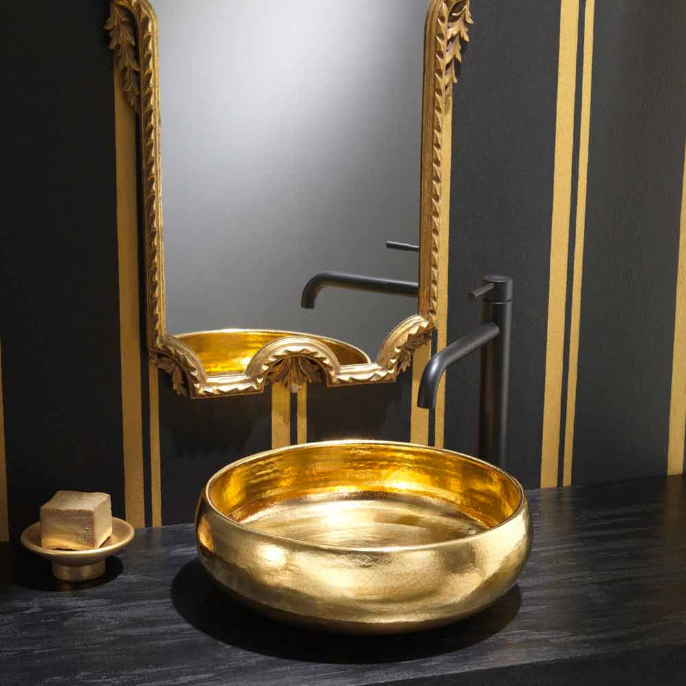 Countertop bathroom washbasin produced and hand-turned in Italy in raku ceramic with 24 carat gold finish.