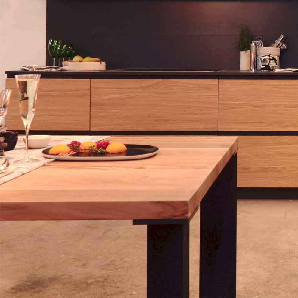 The Yvonne fixed table is characterized by a top in natural Italian walnut painted with a natural effect, legs in anthracite, powder coated metal.