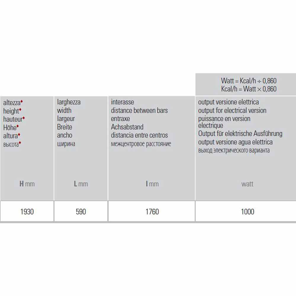 Measures H 1820 + 110 thermostat x L 590 x Inter. 1760 mm x Output w (Ī”t50 °) 839