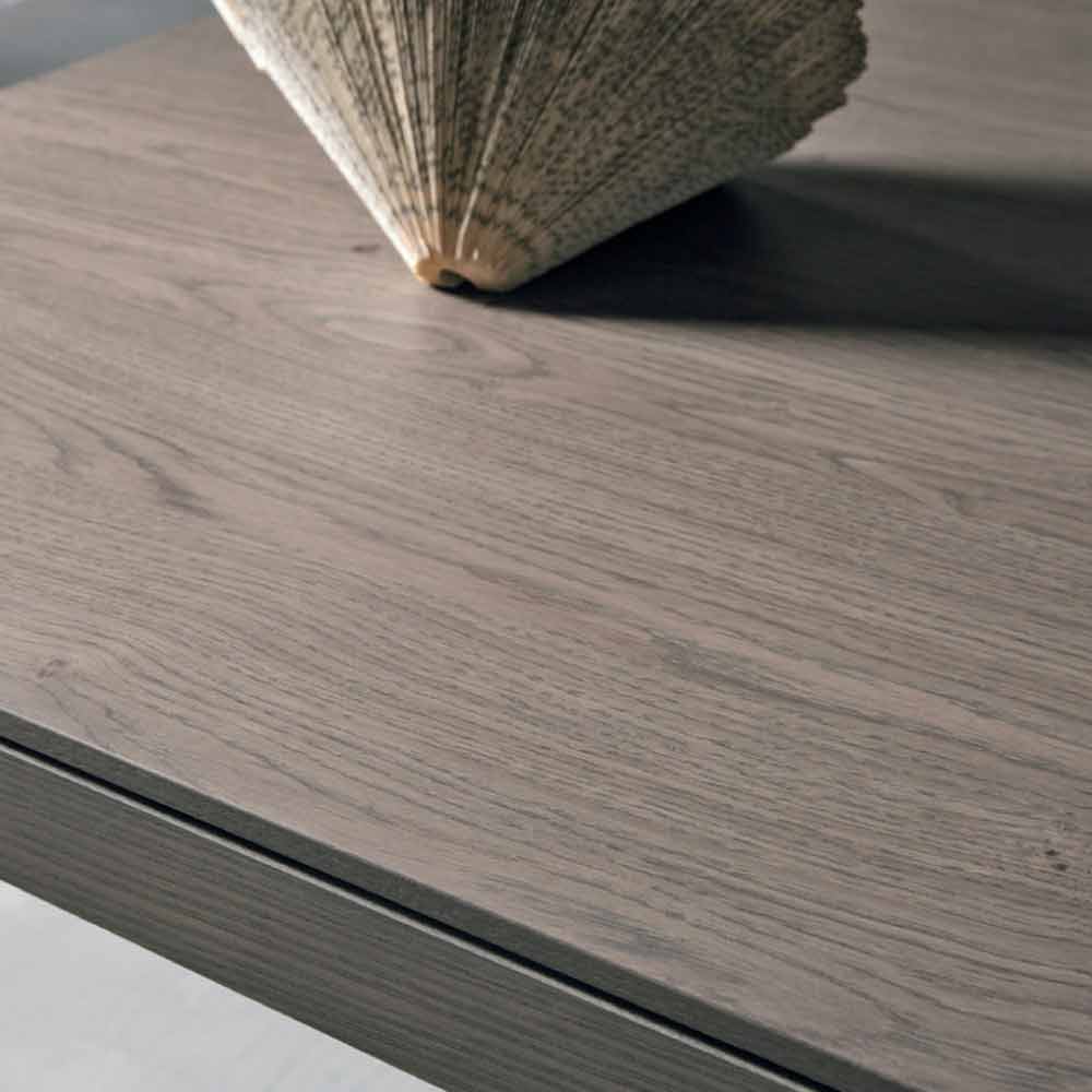 It has a structure of inclined panels (4mm thick) in micro-embossed anthracite finish metal ; inside it is complete with a painted anodized aluminum frame which houses three extensions of 45cm each. The top is made of knotted oak veneer with an inclined profile on two sides, 18+42mm thick and available in different finishes: