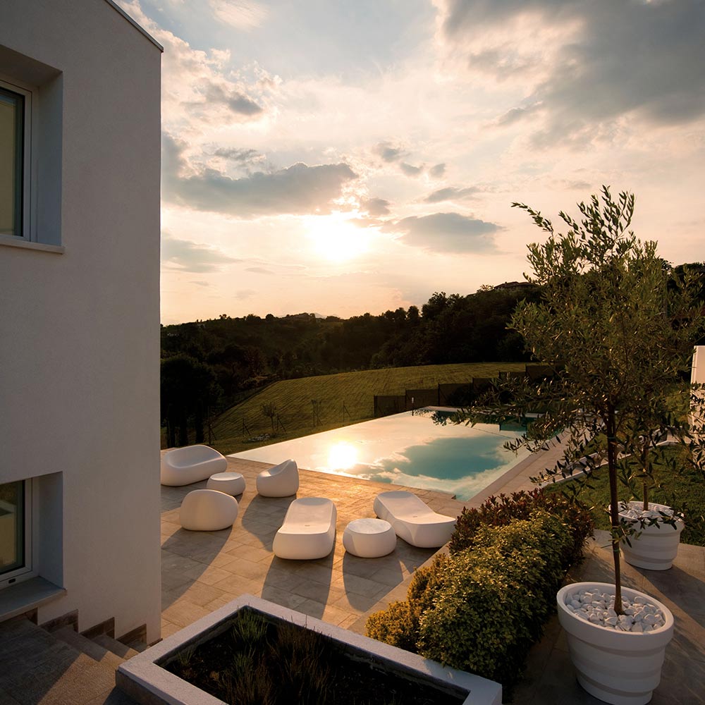 polyethylene available in the opaque version characterized by excellent resistance to the sun, shocks and heat or in the resistant and bright lacquered version that allows you to create plays of light and reflections that become protagonists within the environment or in special finish or filled with a thousand colored balls that shine through the surface.