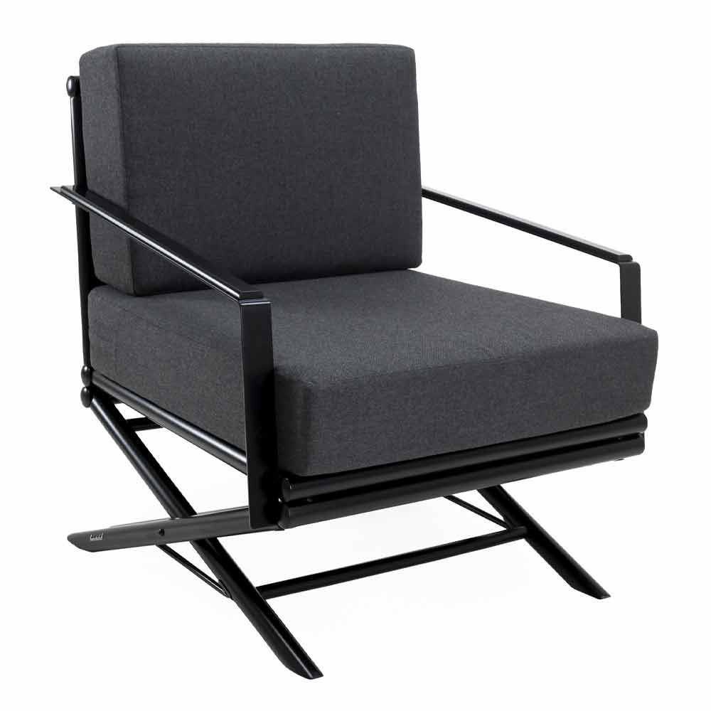 Outdoor relax armchair with natural or black wood structure, batyline seat and fabric cushions, made in Italy luxury.