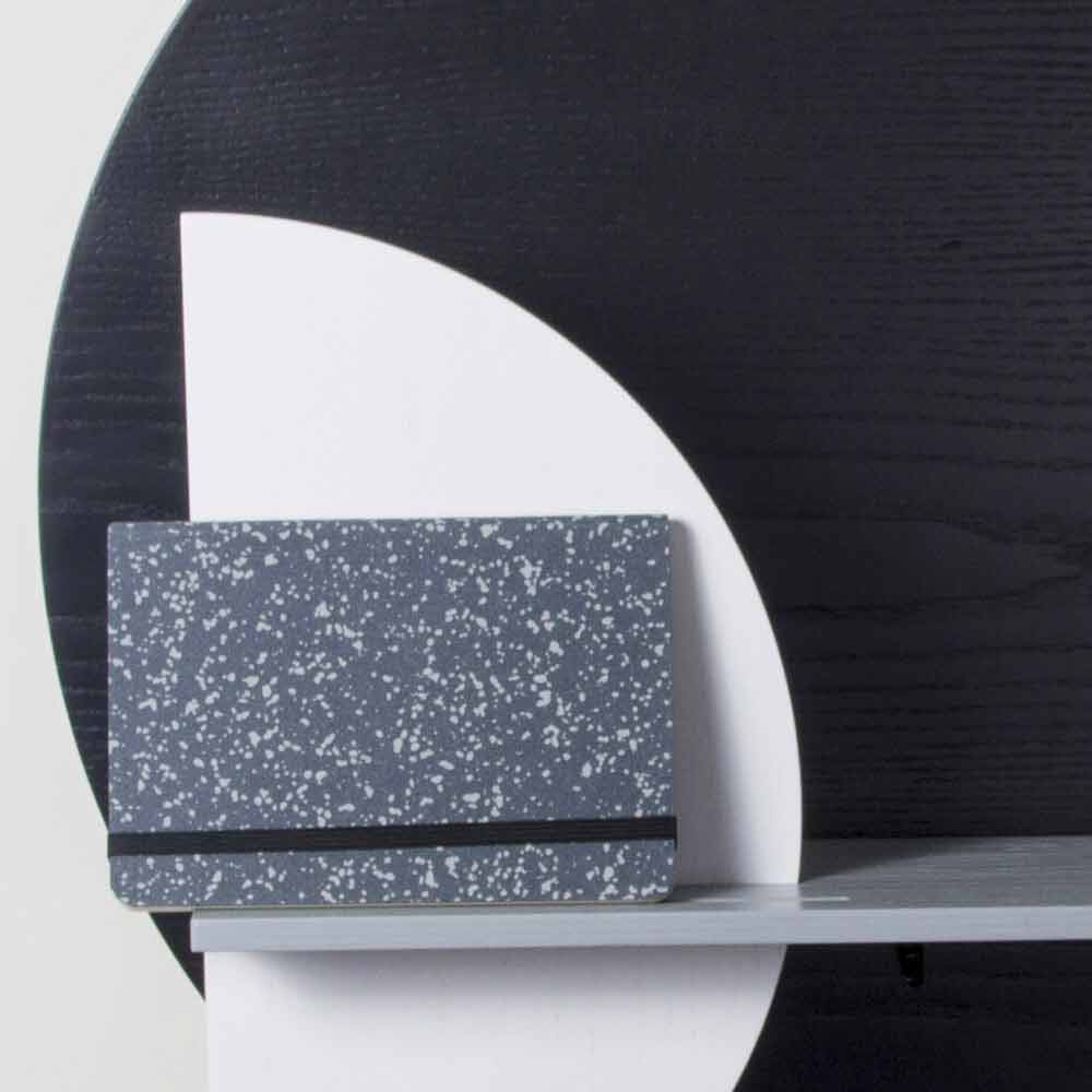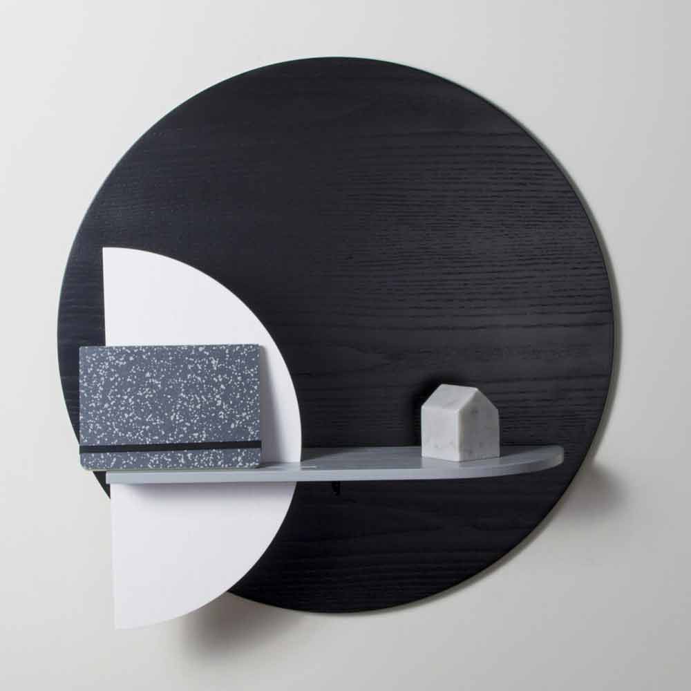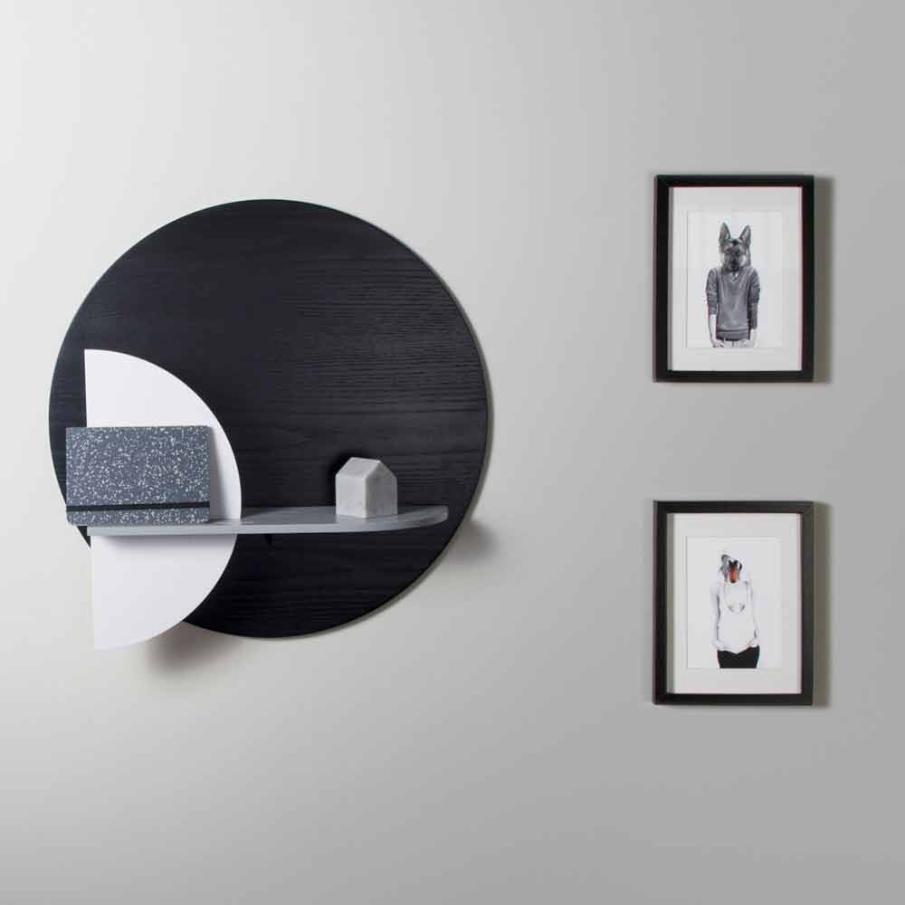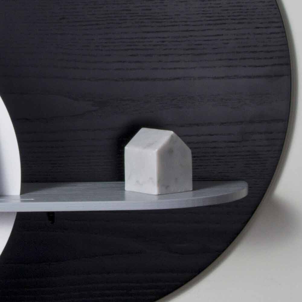 Its structure is composed of 3 panels of different shapes made of white, black and gray stained ash plywood , one of which is mounted on the wall that represents the real support surface and two vertical panels that give movement and harmony. The peculiarity of this shelf is the possibility to customize the product by combining the 2 vertical panels which allow you to choose between 8 different configurations according to tastes and needs.
