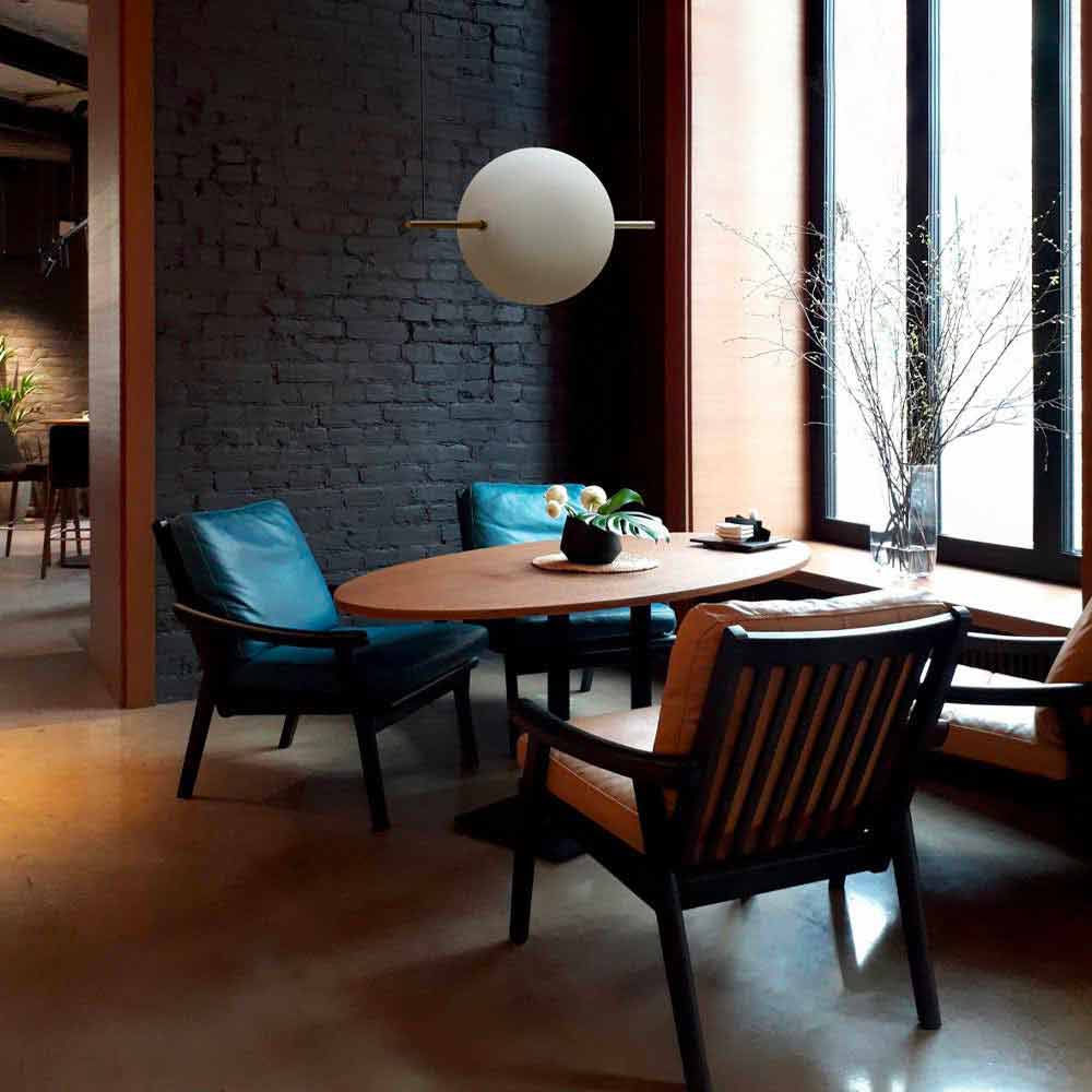 The luminous sphere appears suspended, giving a refined and unique atmosphere, ideal for the most contemporary contexts, leaving a beam of light thanks to the dimmable LED.