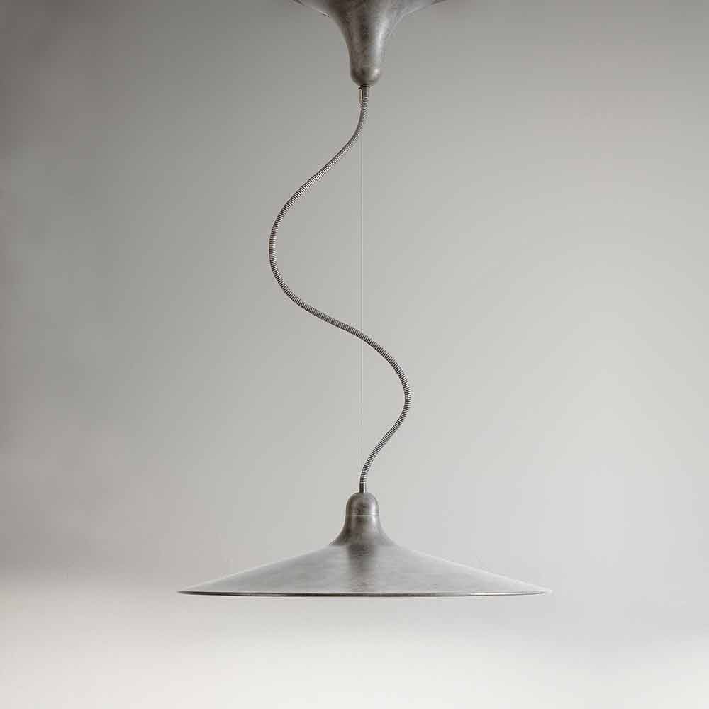 Vintage lighting: retro style suspension in antiqued aluminum, Sassmaòr by Aldo Bernardi, made in Italy.