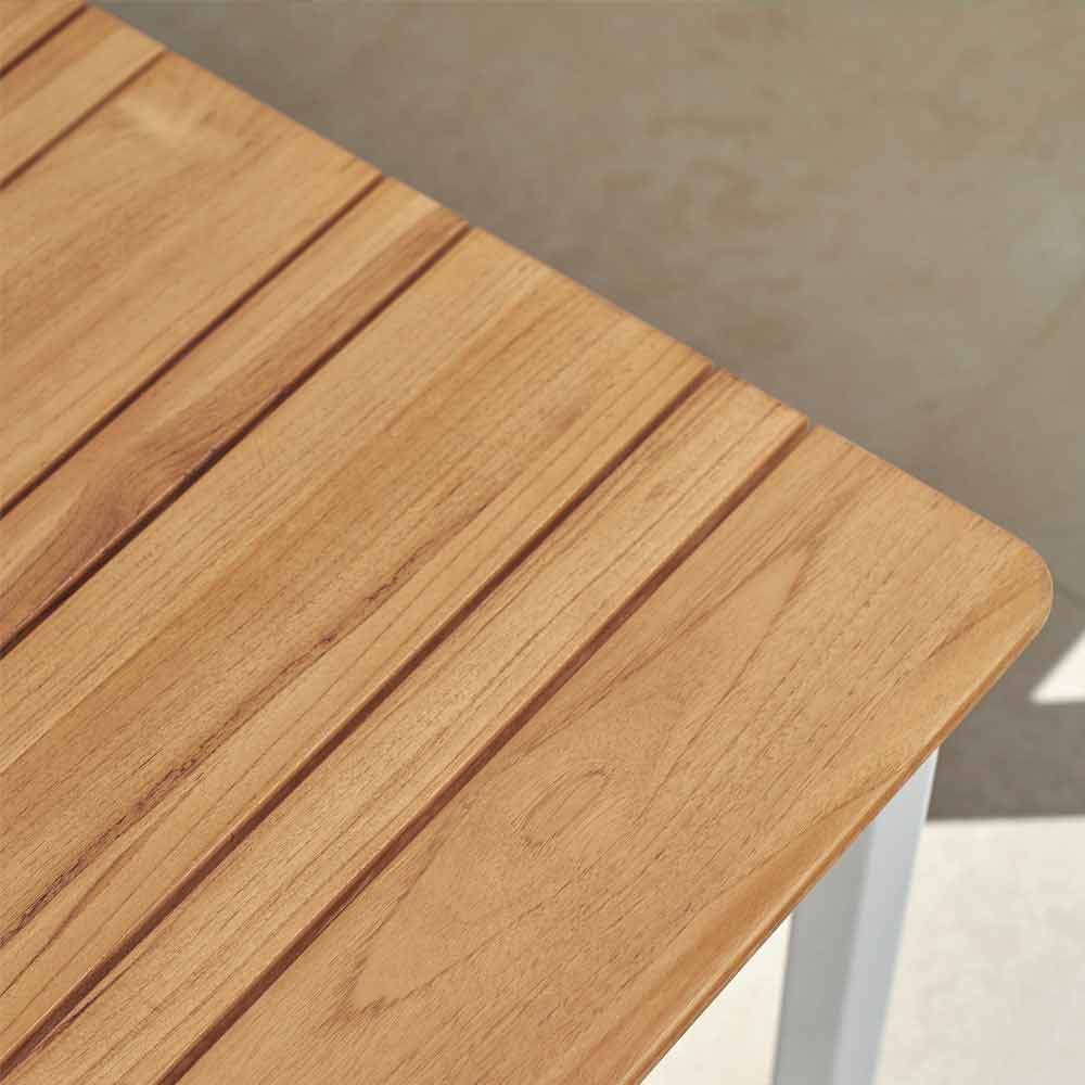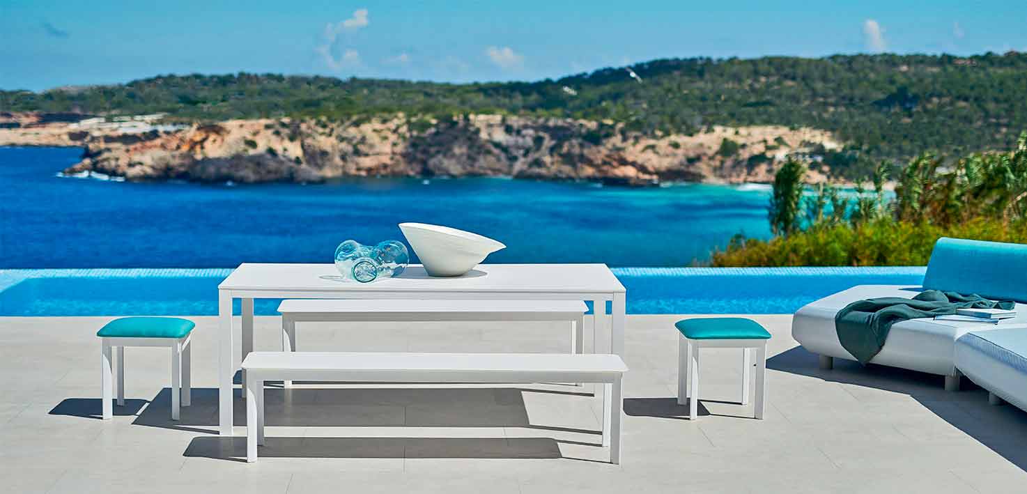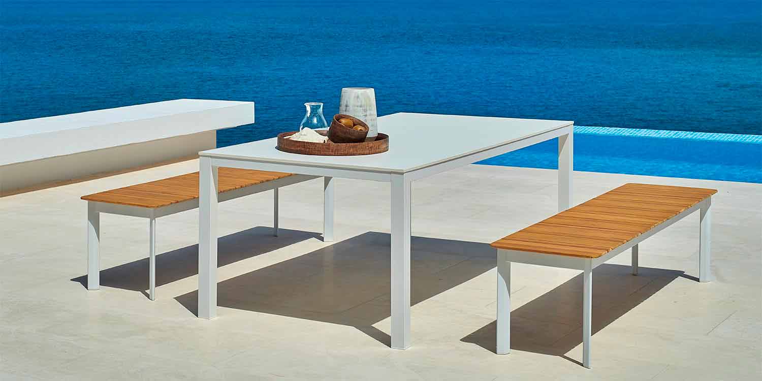 System is a fantastic garden bench with a white powder-coated aluminum structure; with seat top in HPL (sp 1.2) in finish: silk gray black border, white black border, anthracite black border, white white border, cement brown border, bedonia brown border, corten brown border; or with a bush-hammered ceramic top (sp 1.2) in a finish: white lime and gray porphyry; or in teak (sp 1.7) from certified plantation.