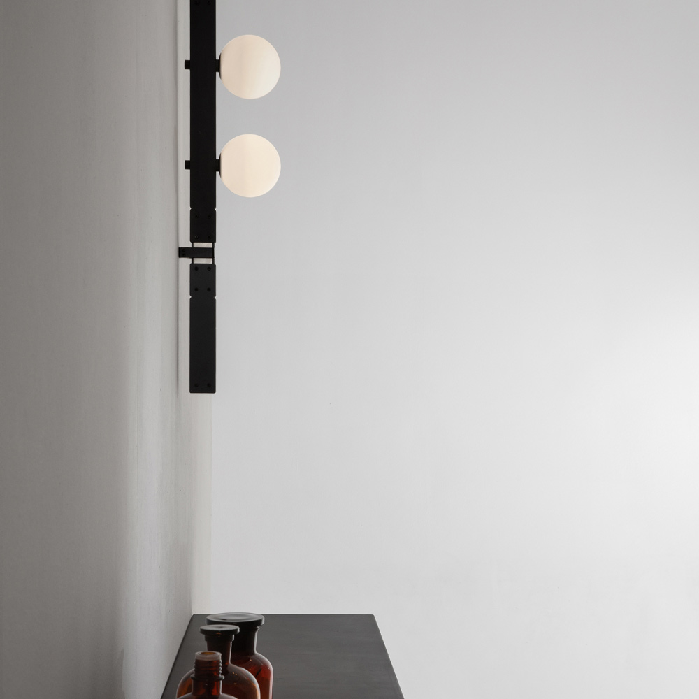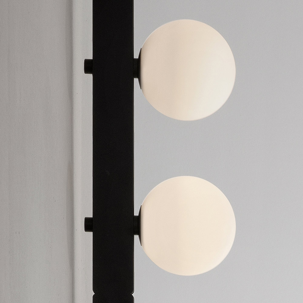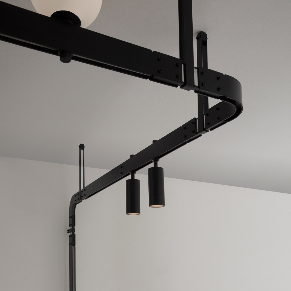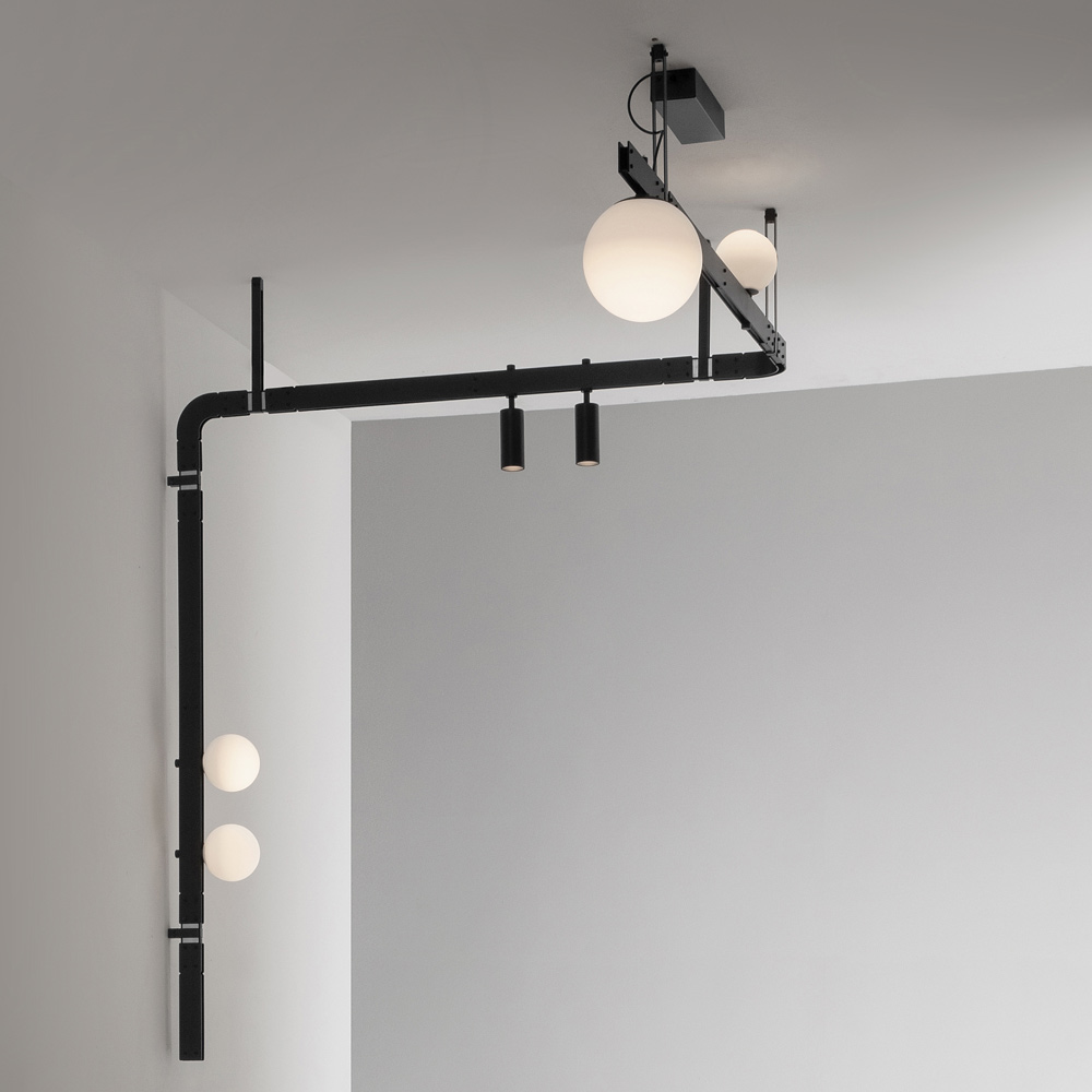 The bearing bar recalls the engineering structures of the past and the electrified modular structures support lighting bodies ( white satin blown glass spheres and spotlights ) that can be placed in quantity and free arrangement, without the use of electrical power cables, for maximum freedom of expression.