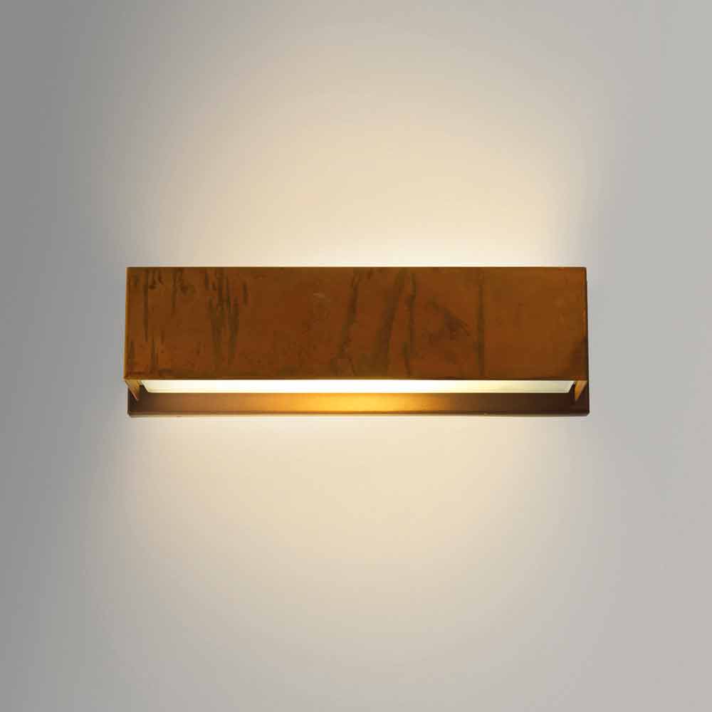 Wall lamp with structure in oxidized brass and sub-base in epoxy powder coated steel. Available in two sizes in the round or square shape. Tempered glass diffuser for direct and indirect light emission.