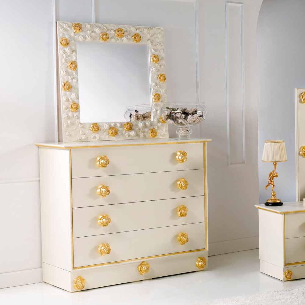 The Flower mirror is characterized by a craftsmanship carried out using quality materials and using the experience of skilled Italian artisans. The frame is made of wood and is decorated with roses. Pickled gold cream finish. Crystal mirror, 4mm thick. Made in Italy. To hang both vertically and horizontally.
