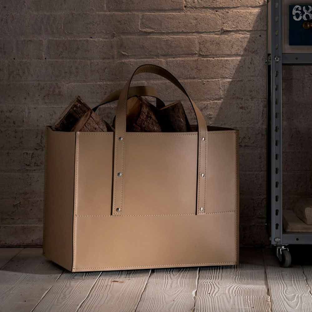 Design firewood holder in Maneghe leather, made in Italy