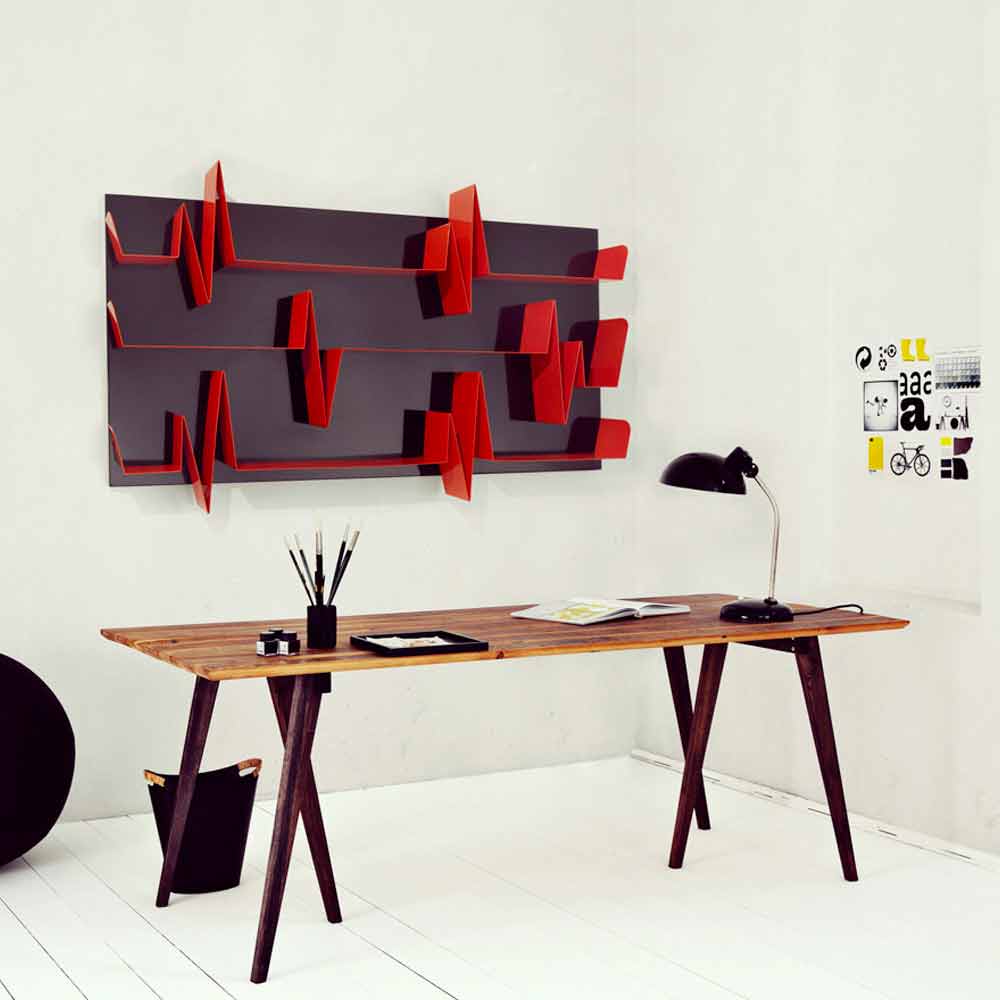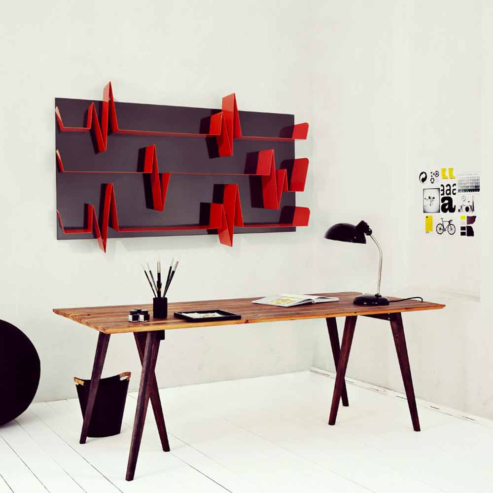 The heartbeats become the shelves of this original wall mounted bookcase, made of painted iron.