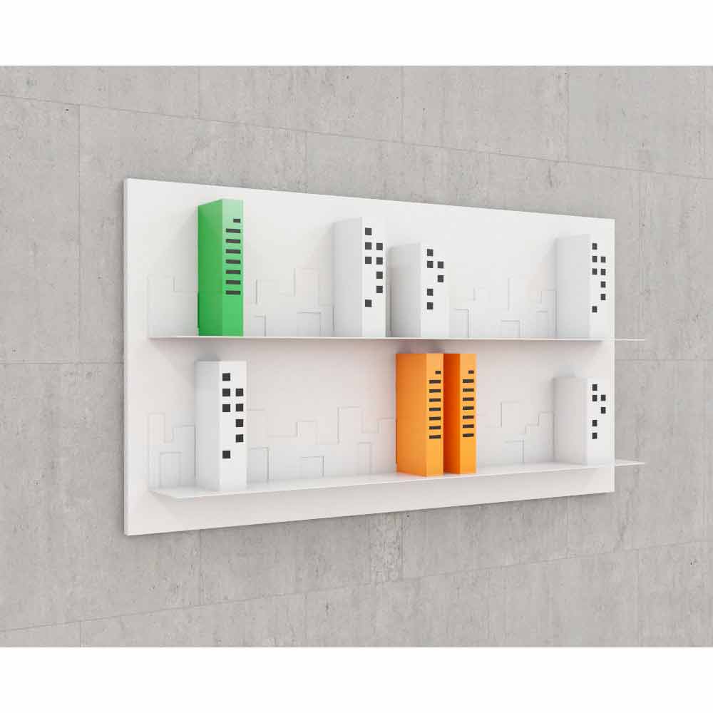 Like a painting hung on the wall, Skyline reproduces the look of a modern metropolis. Its skyscrapers divide the three levels and can be used as bookends. An original and functional idea to decorate your house and your office.