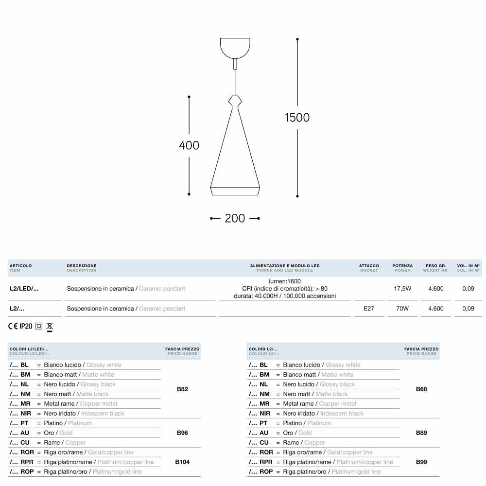 I Lustri is available with different finishings and with socket for standard light bulb E27 or with LED light.