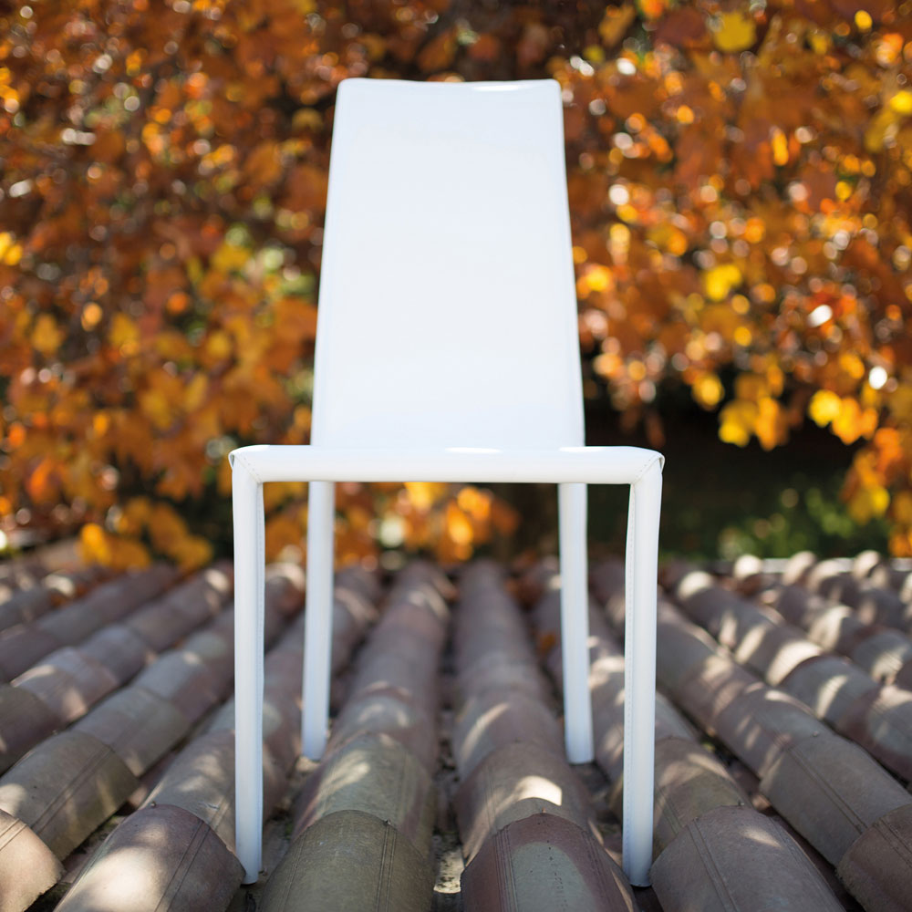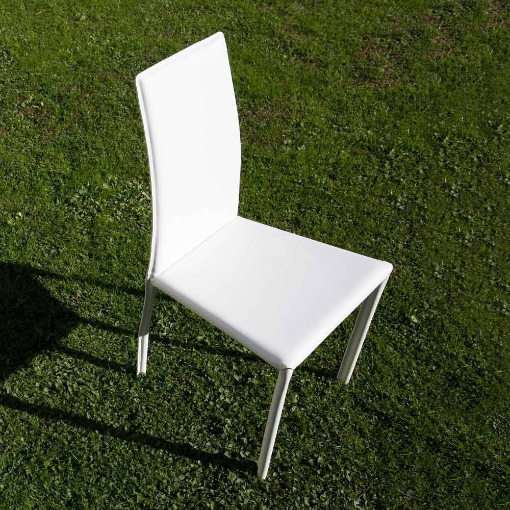 Dining chair entirely made in Italy, completely covered in white leather and structure with round leg of ø 22 mm.
