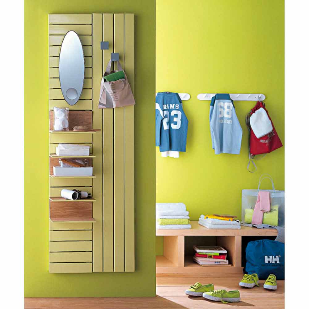 Hydraulic radiator, practical and functional with a linear design, heats and organizes every environment in which it is inserted. Vertical radiator in colored steel, complete with shelves (as shown in the photo) with backrest-shelves and top in natural oak.