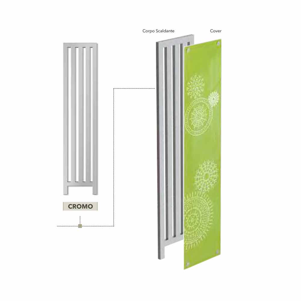 Radiator with a chromed steel heating body and a painted, edged steel sheet cover, vertical, in the electric version. A blend of materials between the heating body and the cover plates creates a perfect balance of aesthetics, functionality, and attention to detail. With News Dress, dress up your living space. Choose the color that best suits you!