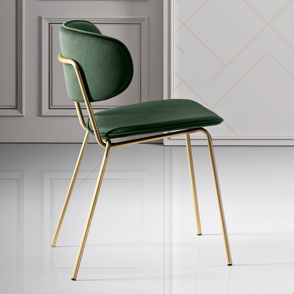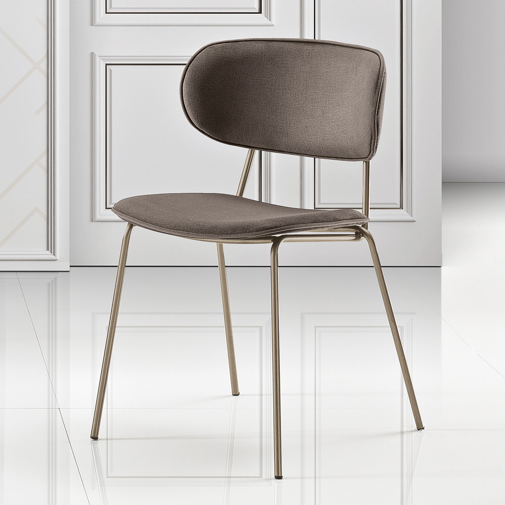 This chair is a design jewel, perfect for those who want to combine functionality and style. The seat and curved backrest are covered in a fabric, offering a comfortable and classy seating experience. The simple yet sophisticated silhouette of the chair is accentuated by the metal legs , which add a touch of modern warmth and a sense of visual lightness.