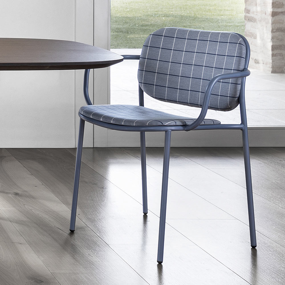 Living room chair Ā  entirely made in Italy with stackable structure in painted metal complete with upholstered armrests and seat and backrest covered in fabric . An aesthetic with traditional features revisited in a contemporary key to add a touch of refinement to a simple and versatile design . Its innovative style is based on concepts of originality and extensive customization . In fact, the chromatic variety of the proposed fabrics perfectly matches the wonderful nuances for the structure, offering the possibility to play with the imagination for unique and creative color combinations, able to coordinate the interiors while characterizing the environment thanks to the personality and materiality. of the chair.