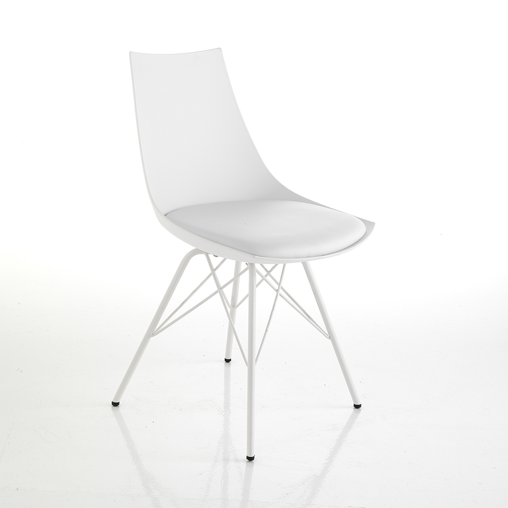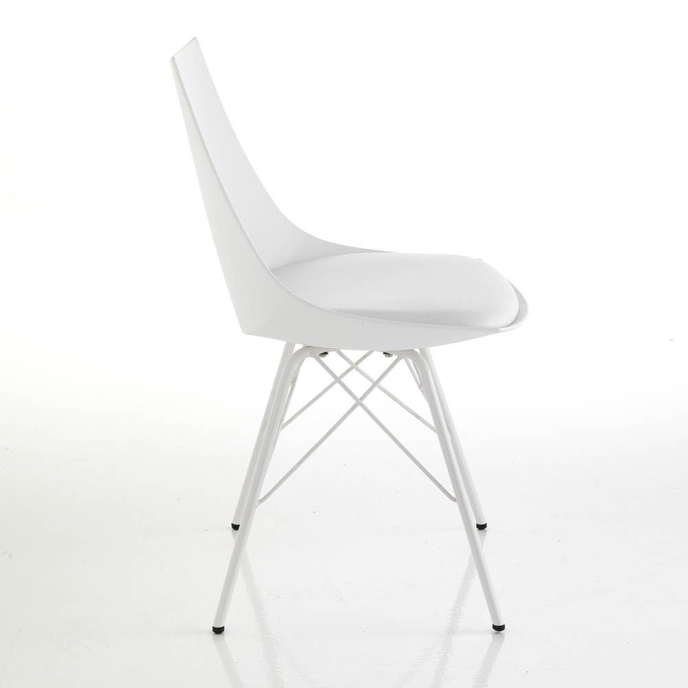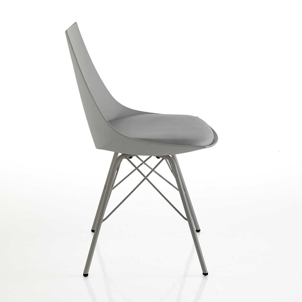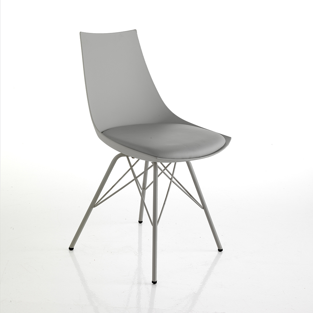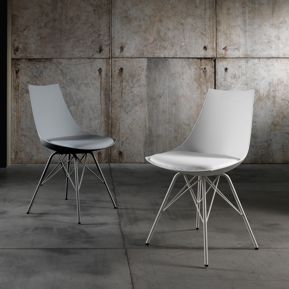 Chair for dining room or kitchen with structure made of shiny painted metal , shell in matt polypropylene and padded seat covered in synthetic leather . A complement with an innovative and refined design, ideal for modern furnishing situations that require a touch of personality .