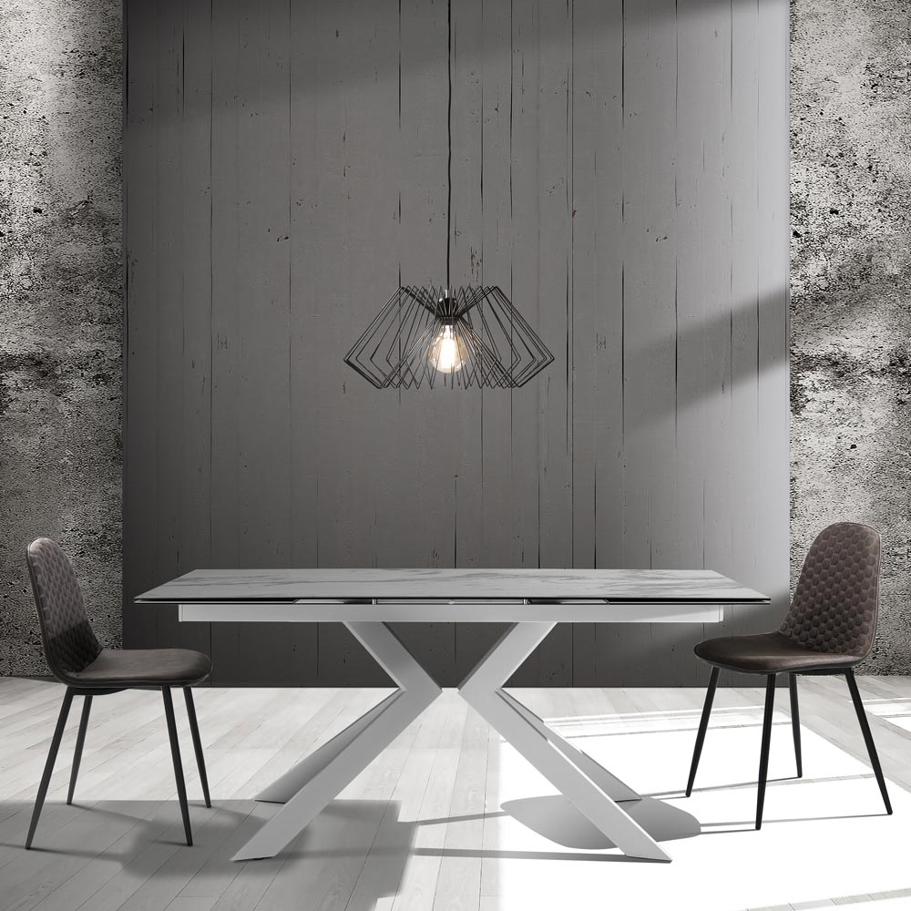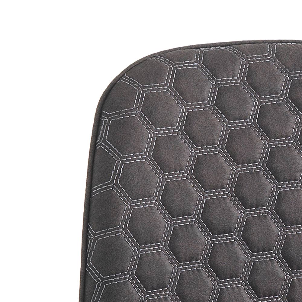 Dining room chair covered in aged velvet effect microfibre fabric with backrest in black synthetic leather and matt black painted metal structure. Enriching the simple aesthetics of the chair is the padded and quilted backrest with geometric stitching that makes the final look unique for a refined and elegant result . Its shape is welcoming and comfortable, therefore ideal for ensuring a soft and comfortable seat within domestic spaces such as dining rooms or kitchens but also in contract environments such as bars and restaurants where it completes the surrounding furnishings with personality and taste .