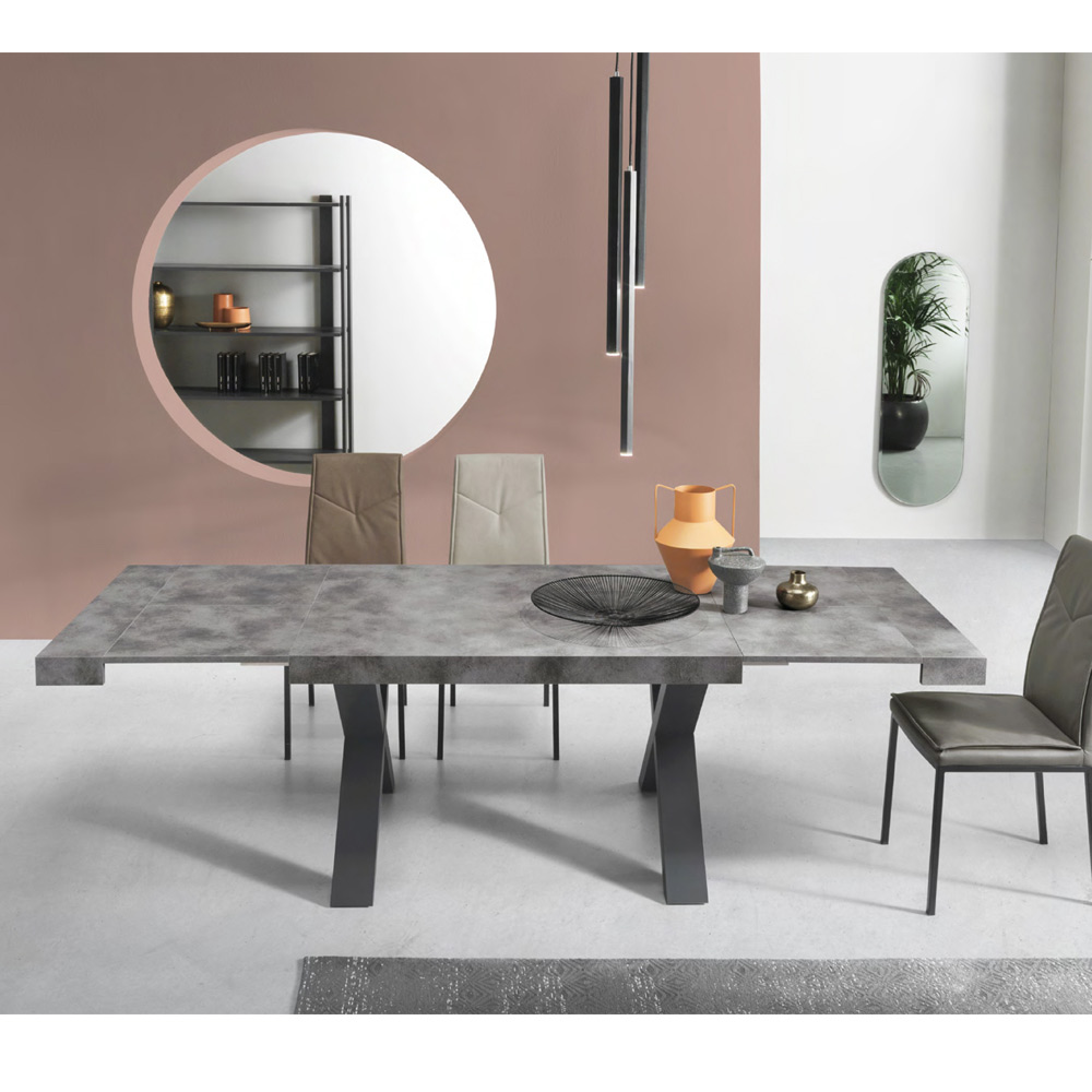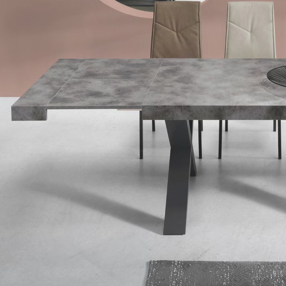 Dining table with top and extensions in concrete-effect laminate and structure in anthracite finish. A furnishing accessory entirely made in Italy designed to satisfy the requests of those looking for quality , elegance and functionality within a single product. What is striking about its aesthetics is the particular crossed shape of the base which offers solidity and robustness to the product as well as giving a touch of exclusive personality to its final design. The elegant concrete-effect top instead gives the table an imposing style capable of conquering the role of protagonist within the room thanks also to its important dimensions.