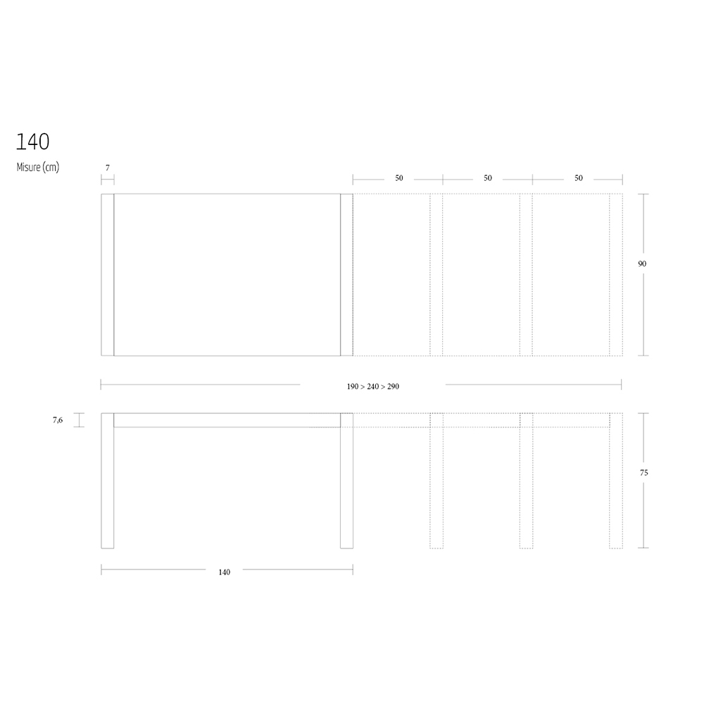 Available sizes:- L 140/190/240/290 x P 90 x H 75 cm - 3 extension leaves of 50 cm;