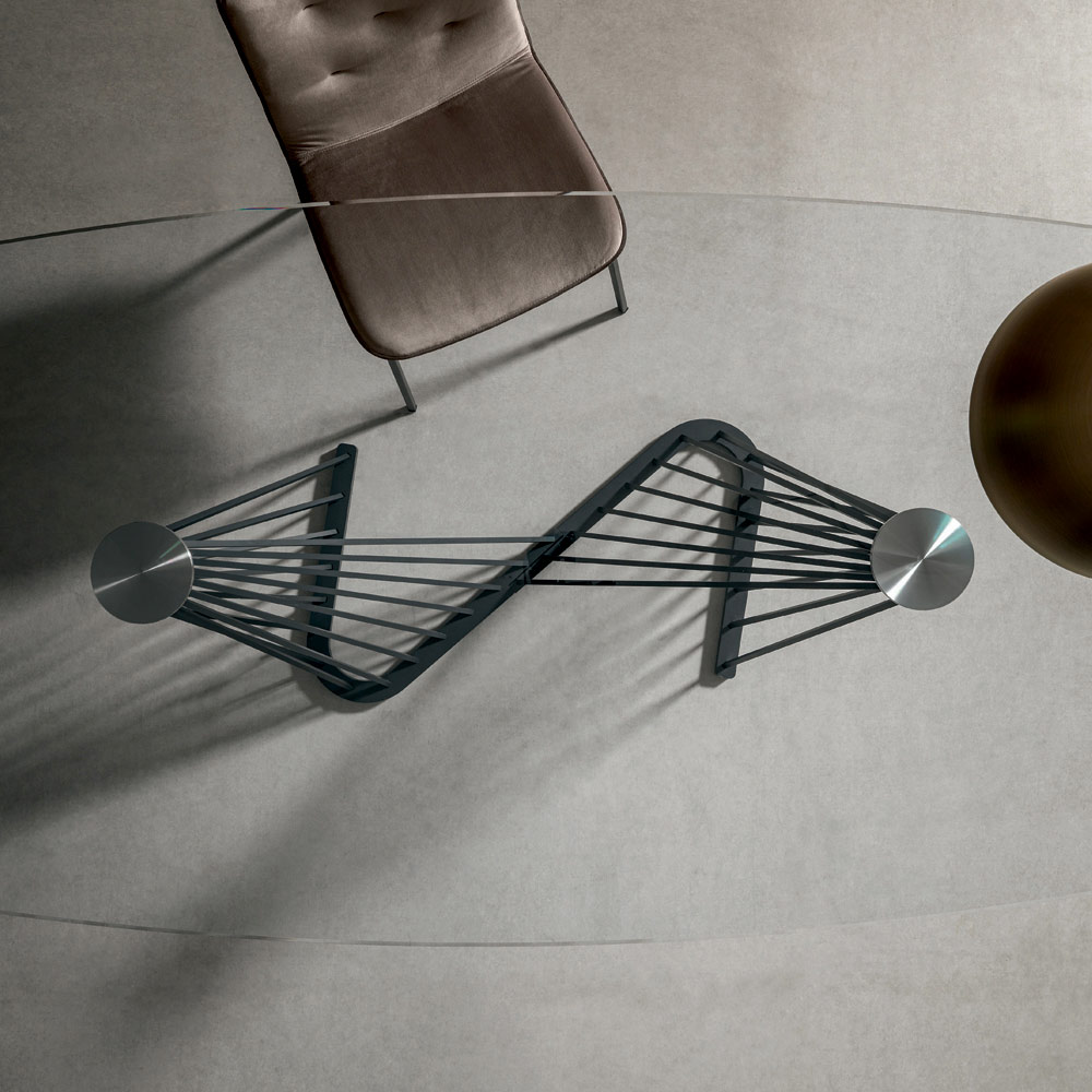 barrel-shaped top in extra-clear transparent tempered glass with beveled edge.