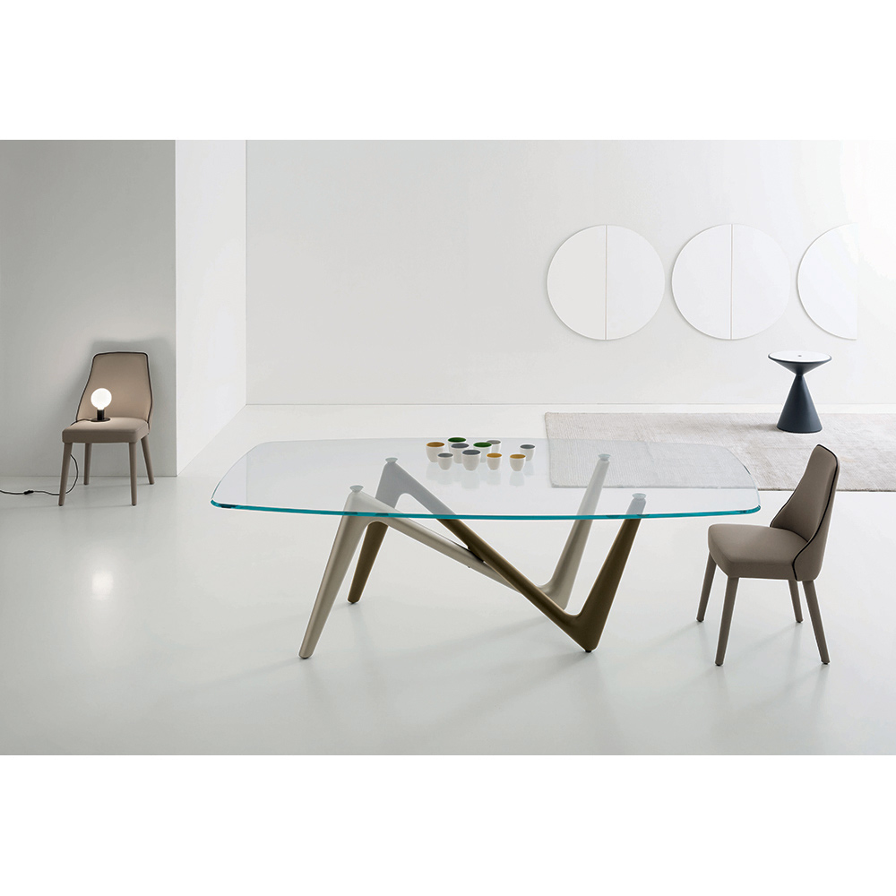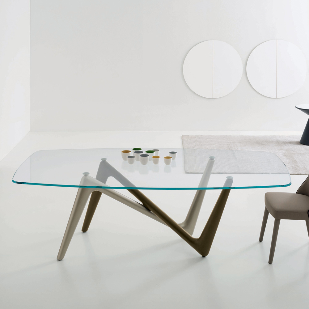 This dining table has a structure with legs in rigid polyurethane painted titanium and metallic bronze and a barrel-shaped top in extra-clear transparent tempered glass with beveled edge.