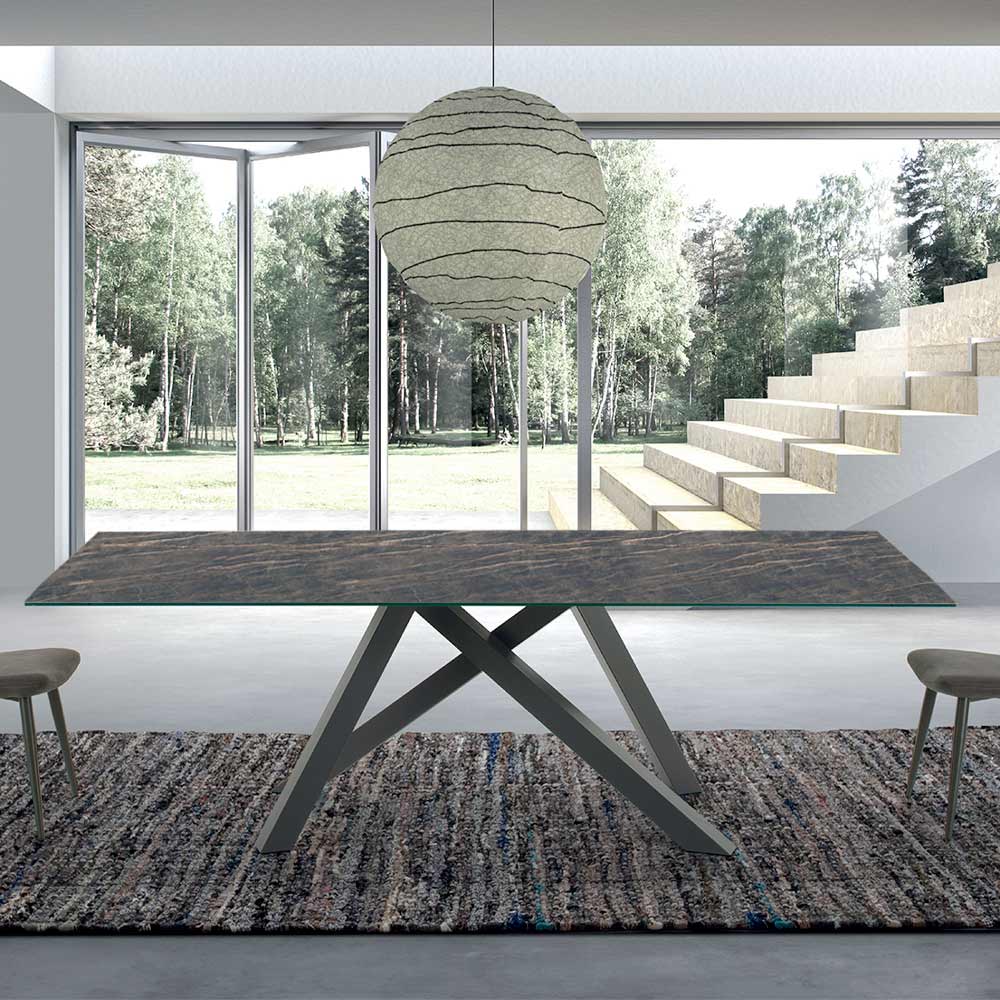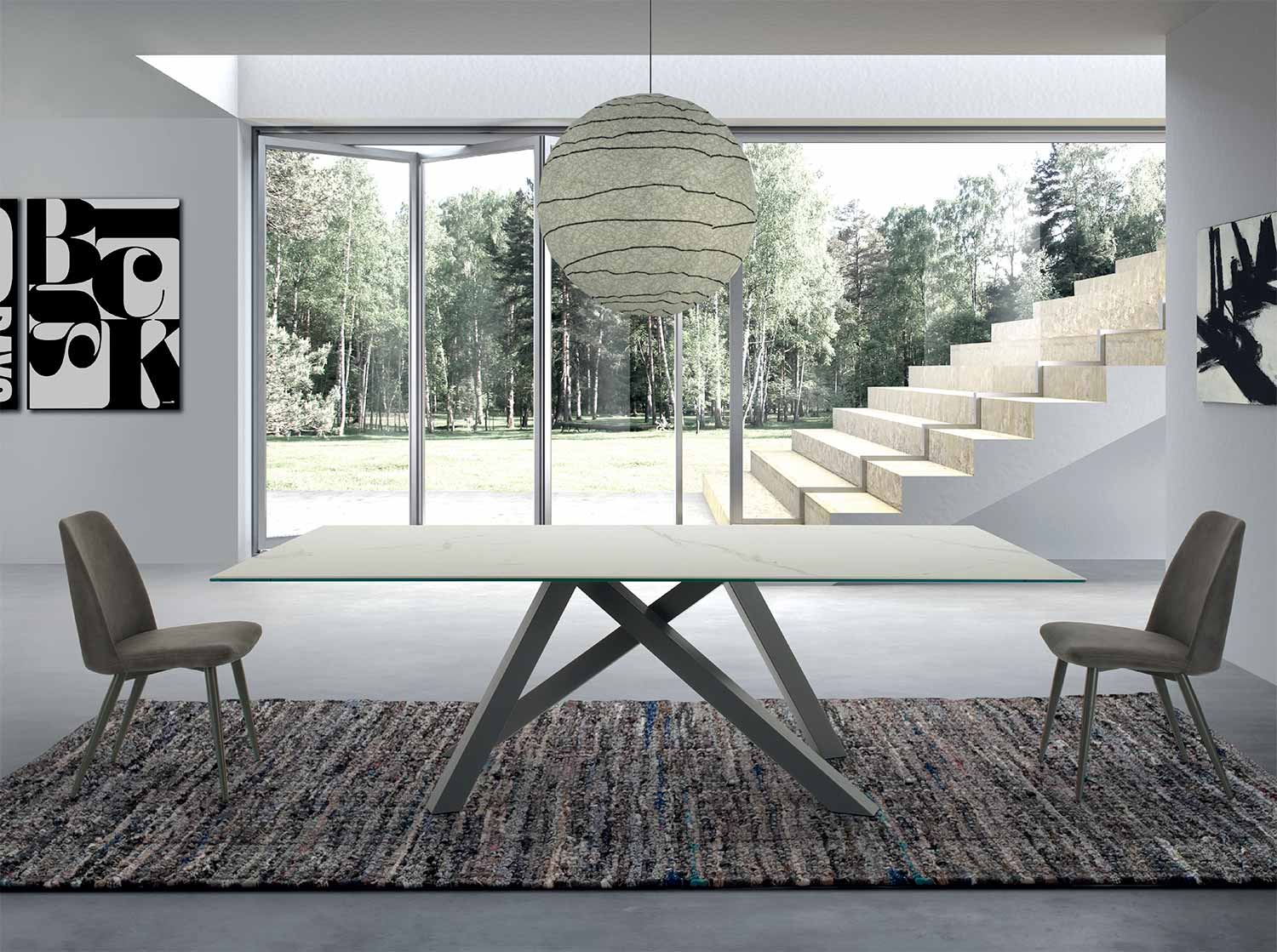 Table with ceramic top and dove gray steel base of modern design made in Italy.