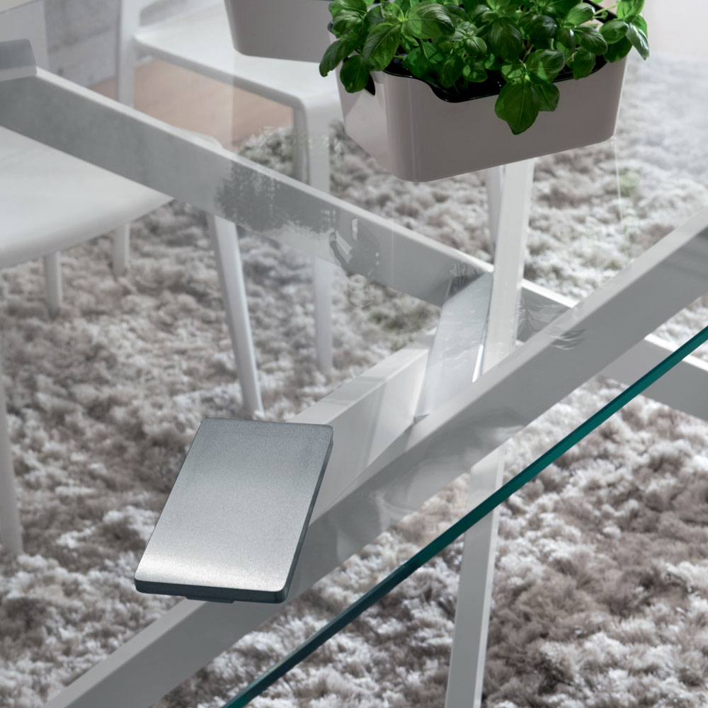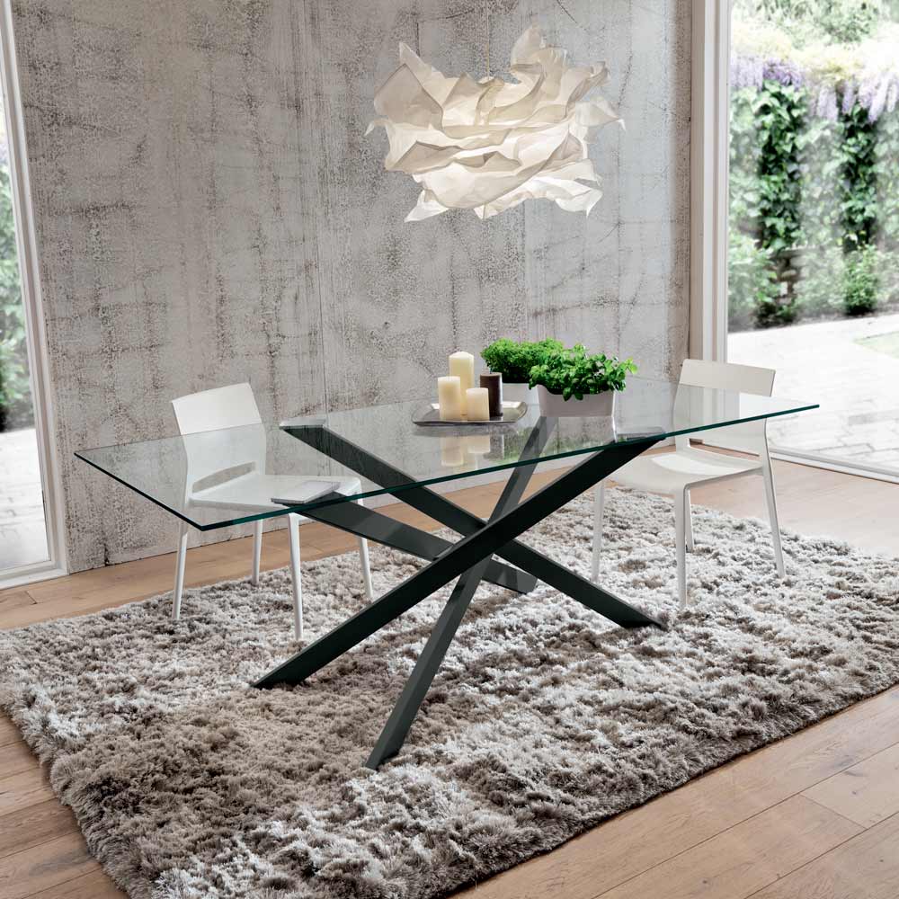 Kitchen table made in Italy with extra-clear tempered glass top and epoxy powder coated metal base. A simple and versatile style that knows how to adapt to any modern furnishing situation thanks to its sober and discreet lines . What makes its design unique is the particularity of the intertwined legs which give a sense of harmony to the table and at the same time increase its value and personality. Thanks to the use of glass, a material with timeless elegance, the final result will represent the perfect combination of modernity and refined style , proving to be a particularly suitable solution for dining rooms or kitchens with contemporary furnishings in which it will win every attention, becoming the real protagonist of the room.