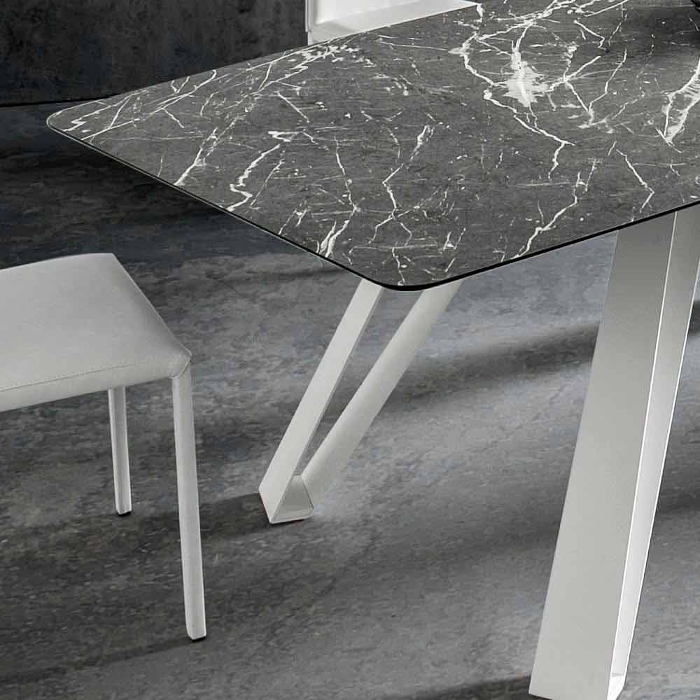 Kitchen table in stratified hpl and precious Made in Italy painted metal.