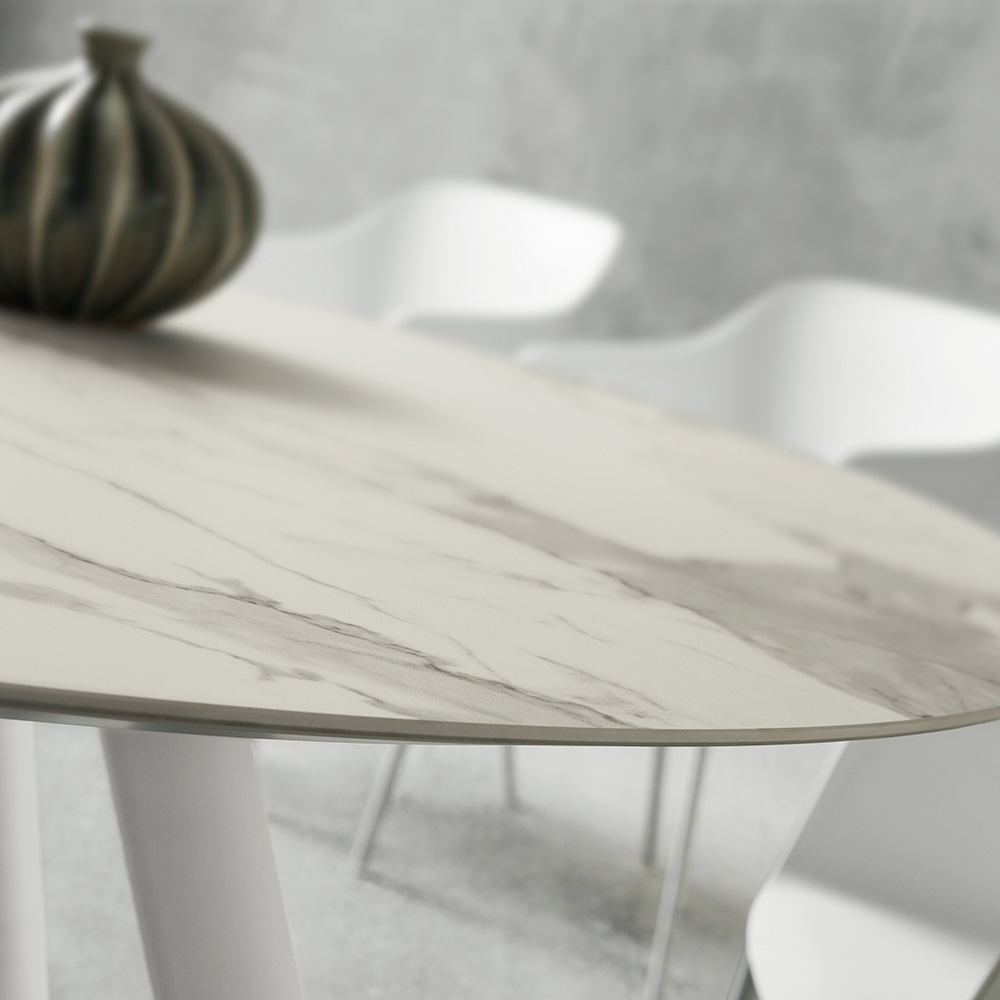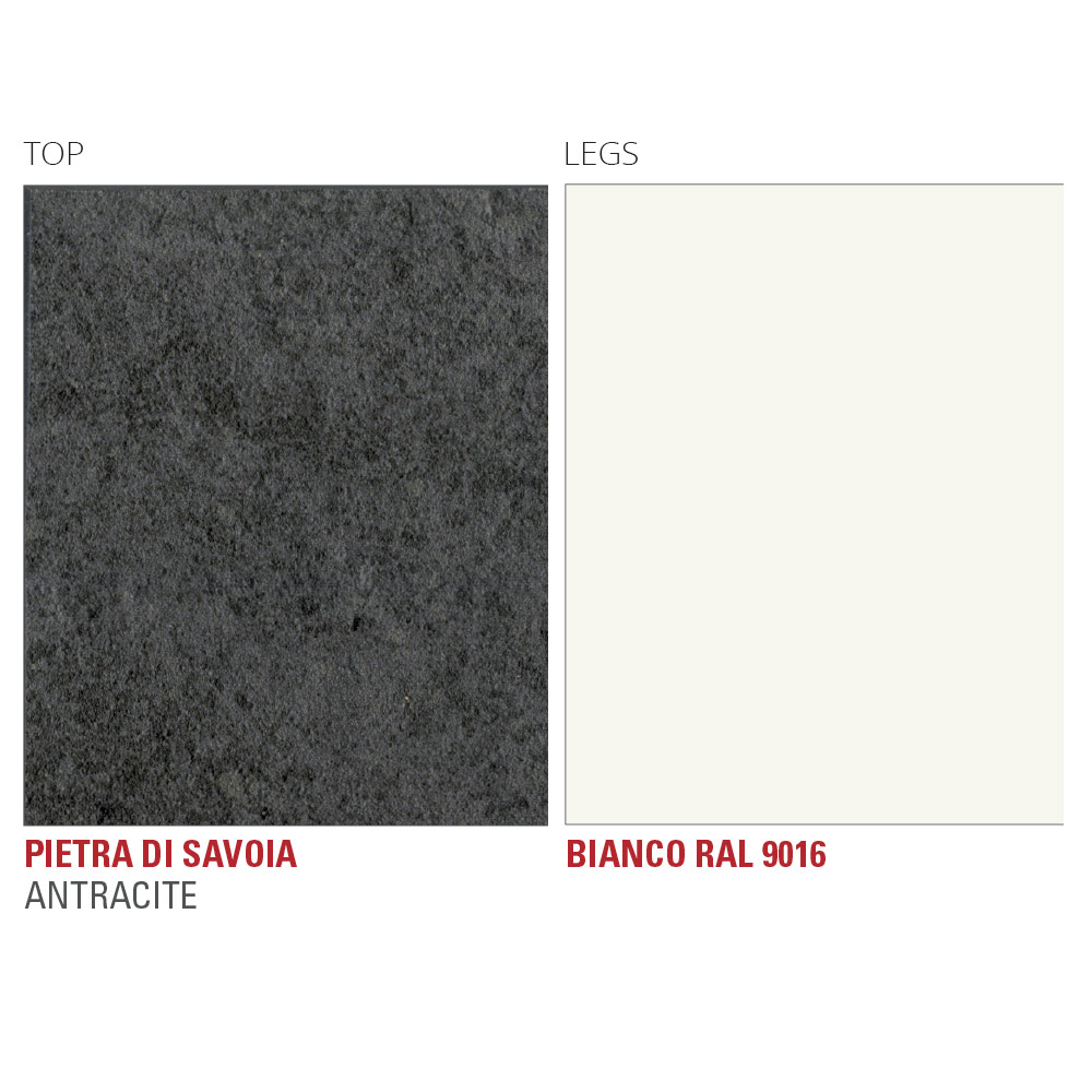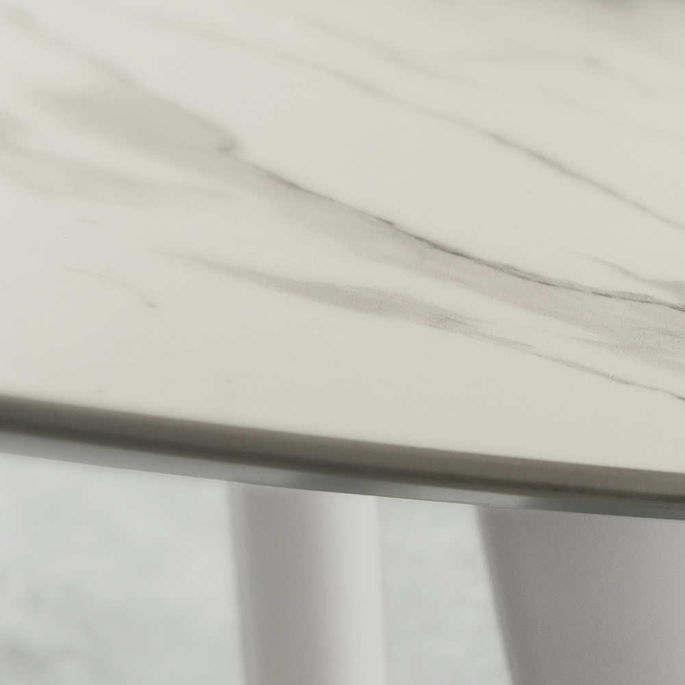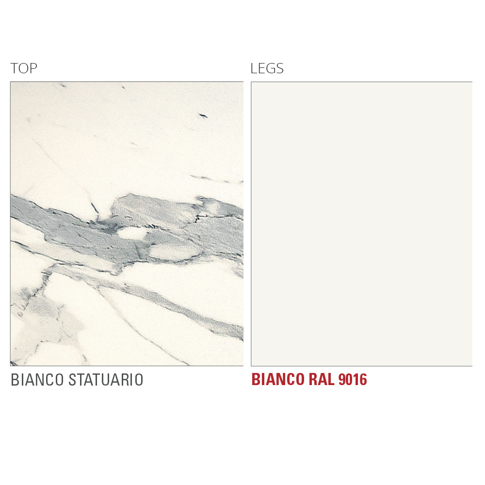 lacquered aluminum legs in white finish. From the encounter between the timeless elegance of the marble effect and the stone effect and the modern touch of aluminum, a piece of furniture with a