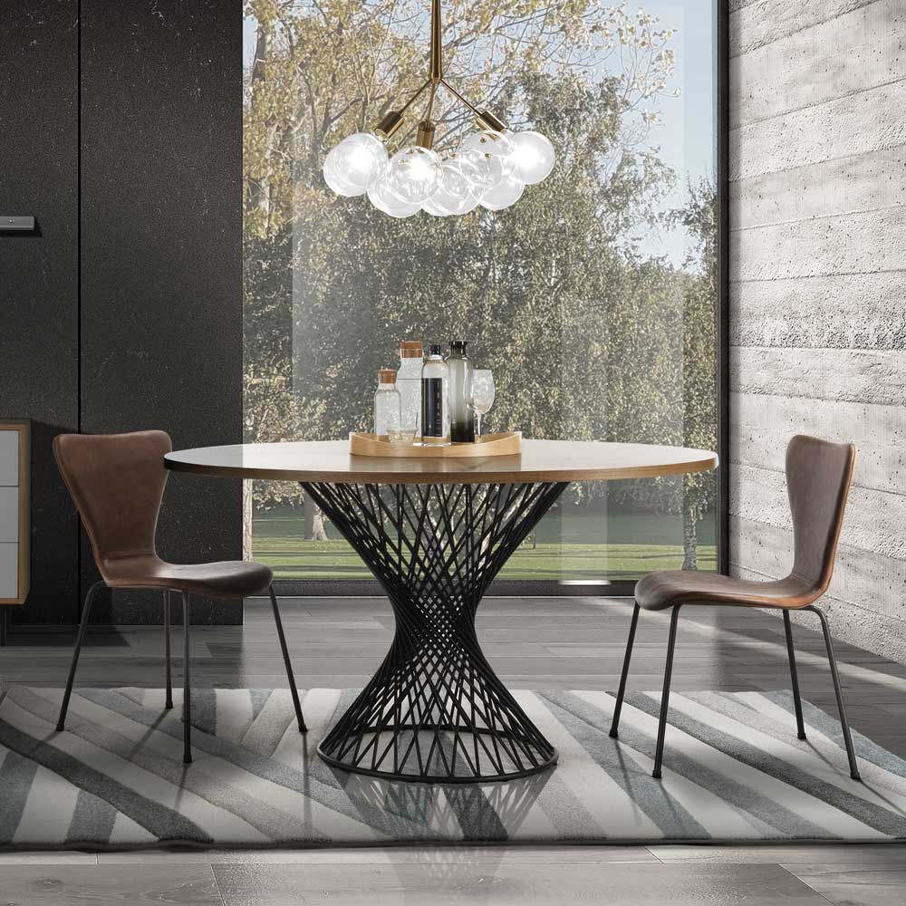 Dining table with round top made of MDF veneered with oak finish and base in matt black painted metal . A furnishing accessory with a rustic style characterized by the particular shape of the structure which gives the product a sense of dynamism thanks to its spiral shape. Thanks to its small size, it will also be possible to furnish dining rooms or kitchens with small spaces with personality without having to give up a touch of character and innovation .