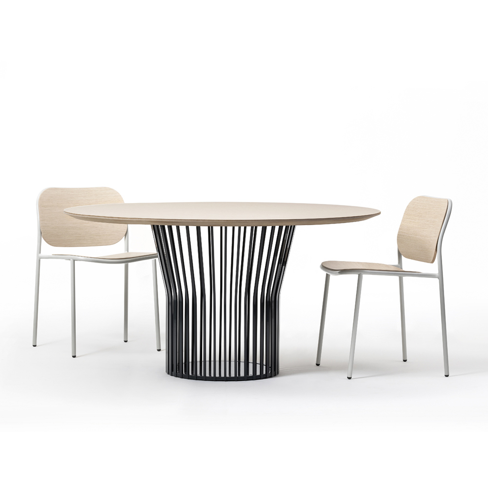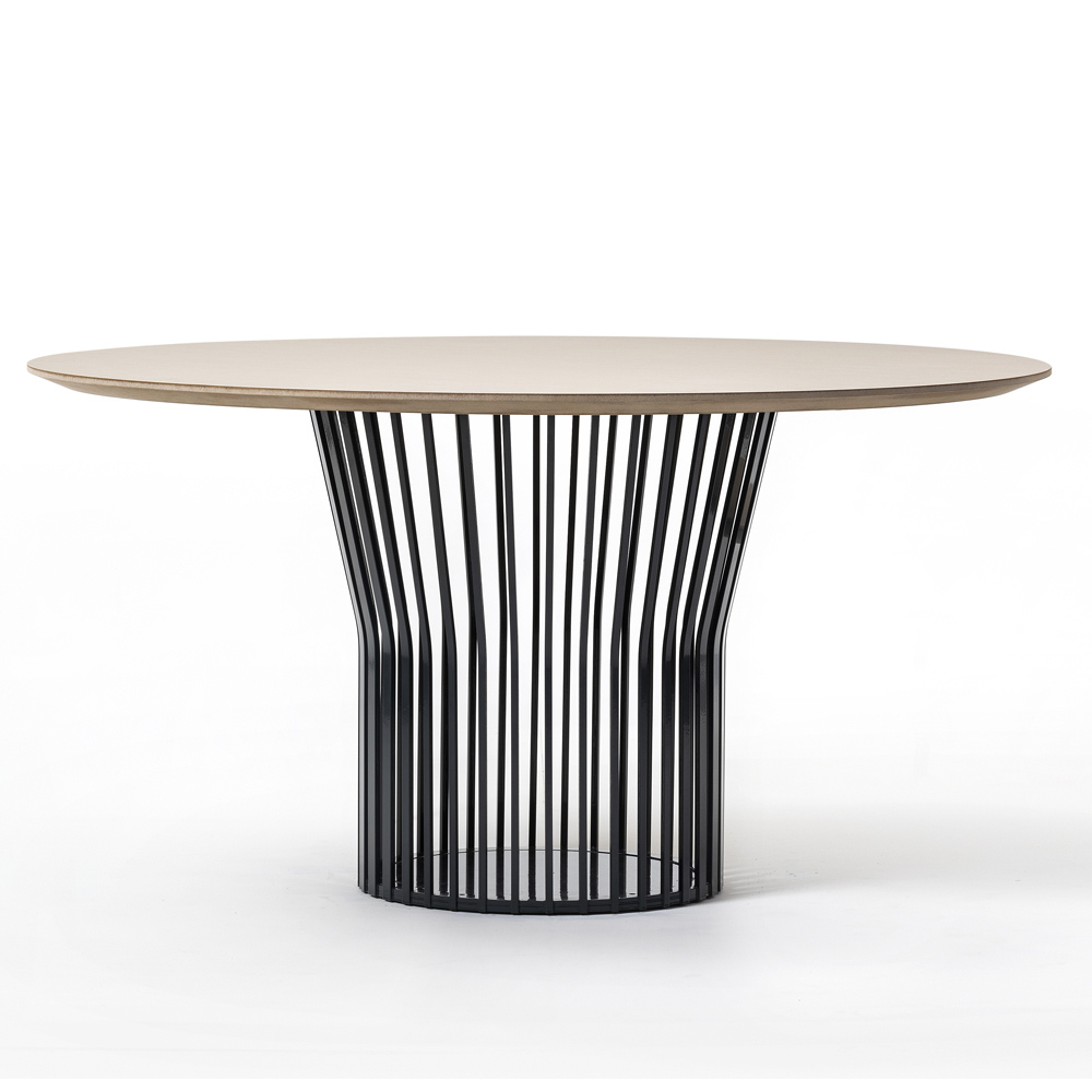 Dining table entirely made in Italy with round wooden top and black painted metal base. The latter represents the real strength of the table thanks to its original and dynamic design composed of many spokes of different widths that fold outwards at the top and then open to support the top. The result is an exclusive product with a refined aesthetic capable of harmonizing with the style of any environment, both domestic and contract, bringing a touch of personality and timeless elegance into the room.