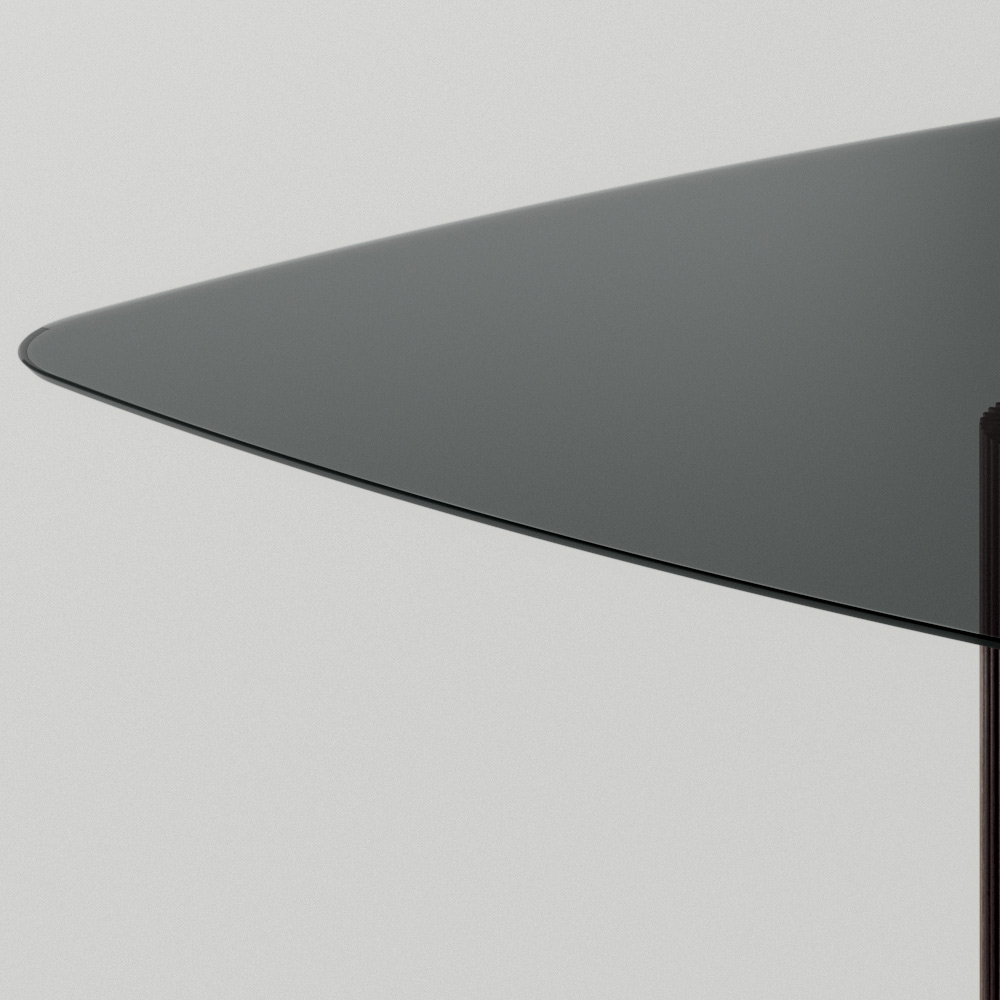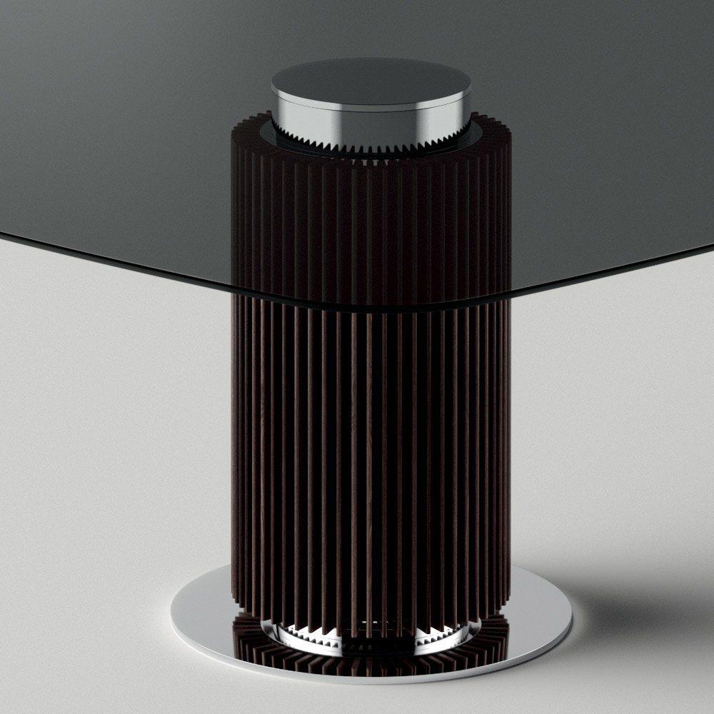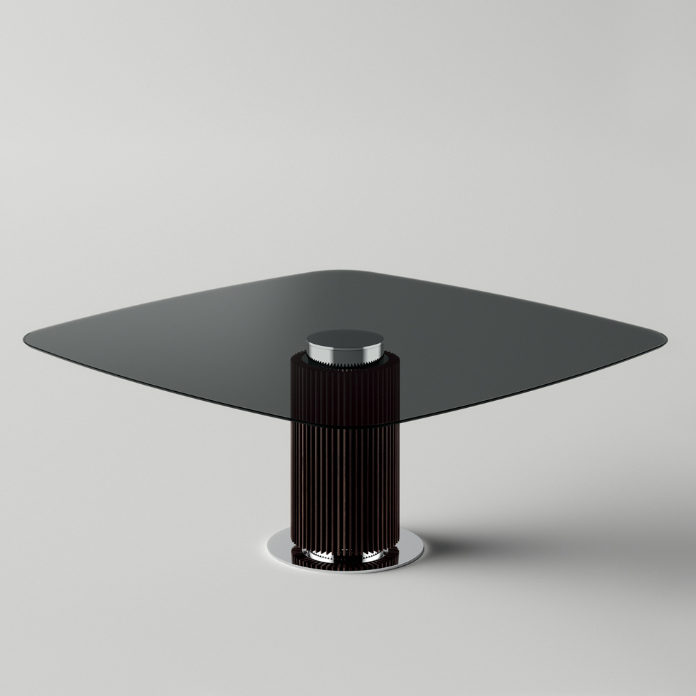 Dining table with square top in smoked glass and base composed of wooden and metal slats . The strong point of its aesthetics is the architectural base characterized by slats that rest on a metal base with a shiny chrome finish. The top with its rounded edge gives softness to the shapes, while the metal elements complete the design of the table, enriching it with personality and sturdiness .