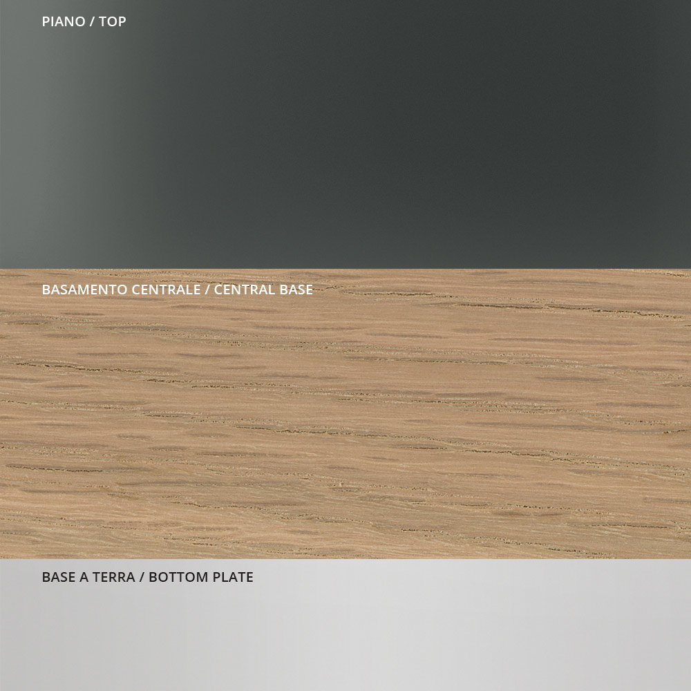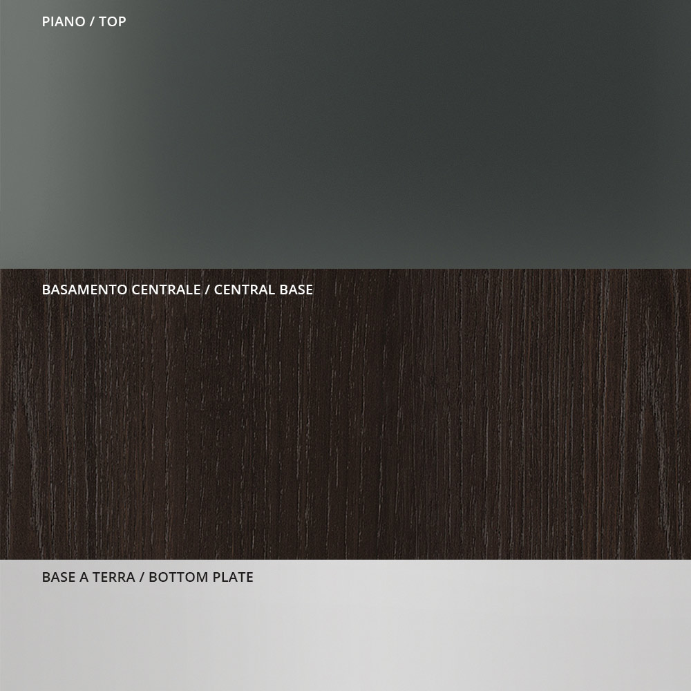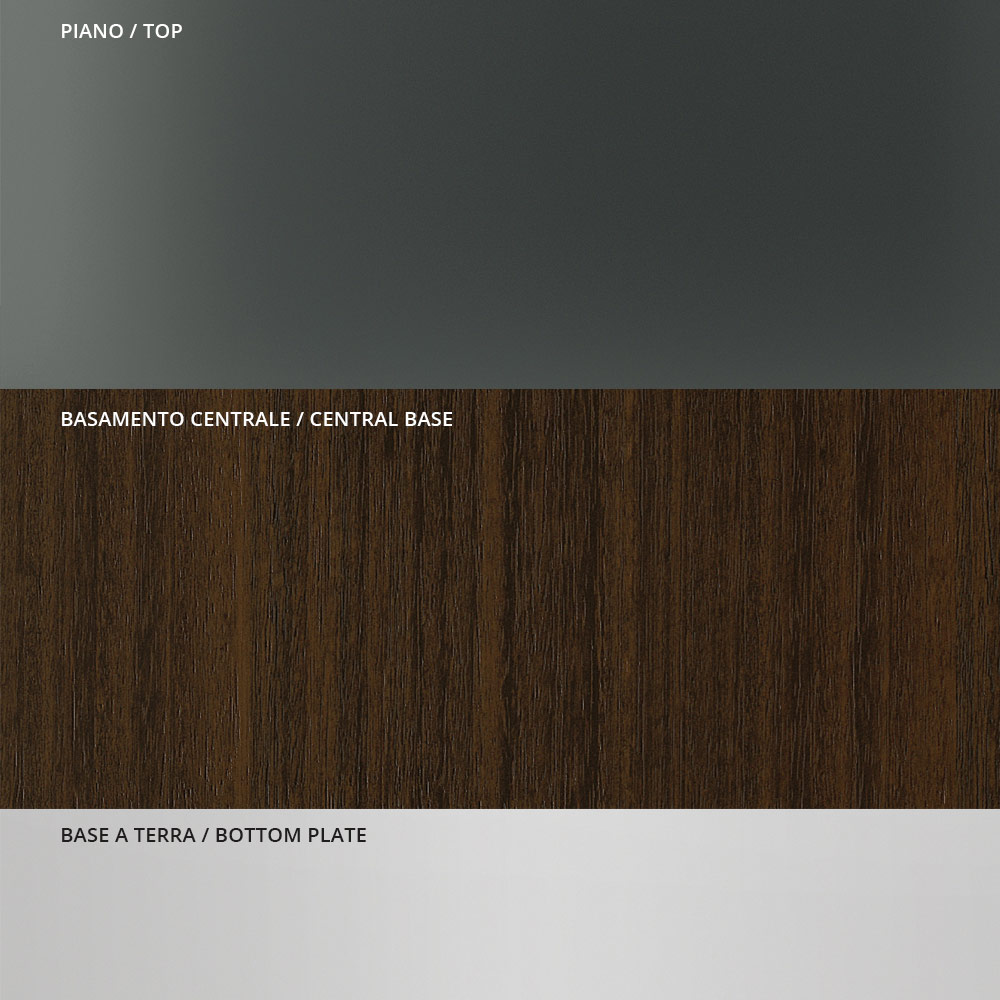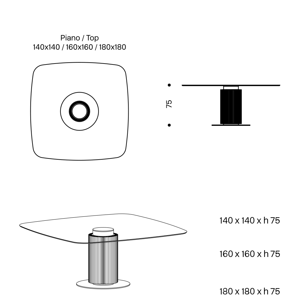 Dining table with square top in smoked glass and base composed of wooden and metal slats . The strong point of its aesthetics is the architectural base characterized by slats that rest on a metal base with a shiny chrome finish. The top with its rounded edge gives softness to the shapes, while the metal elements complete the design of the table, enriching it with personality and sturdiness .