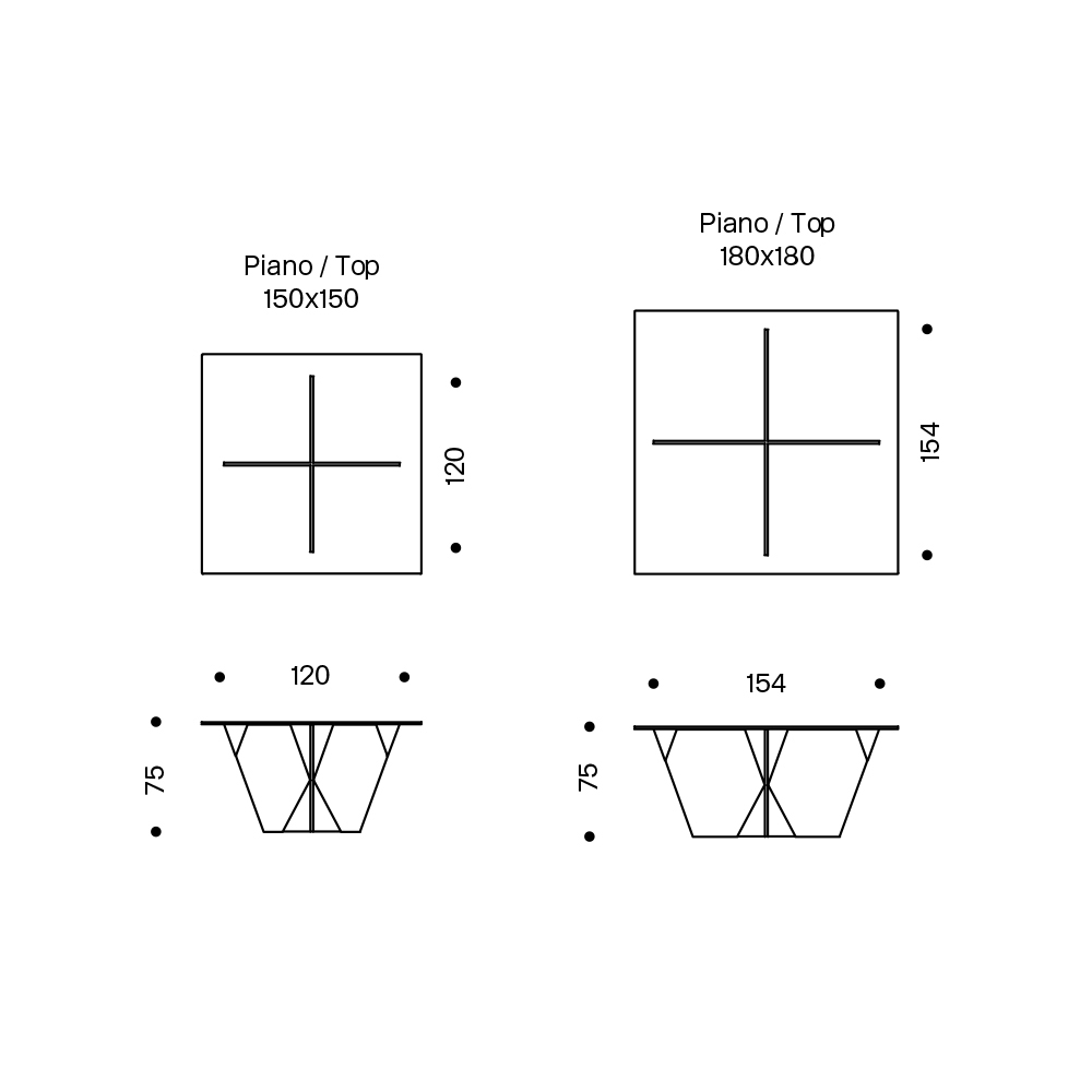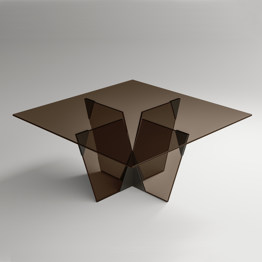 elegant and sculptural structure that comes from the combination of materials of different nature together with the passion for glass processing, thus managing to define a representation of strength and character through different shapes and thicknesses. The strong point of its aesthetics is the architectural base characterized by a pyramidal joint made of metal which constitutes the essential part of the product. The metal elements complete the design of the table giving shape to the glass of the base and enriching it with personality and originality.