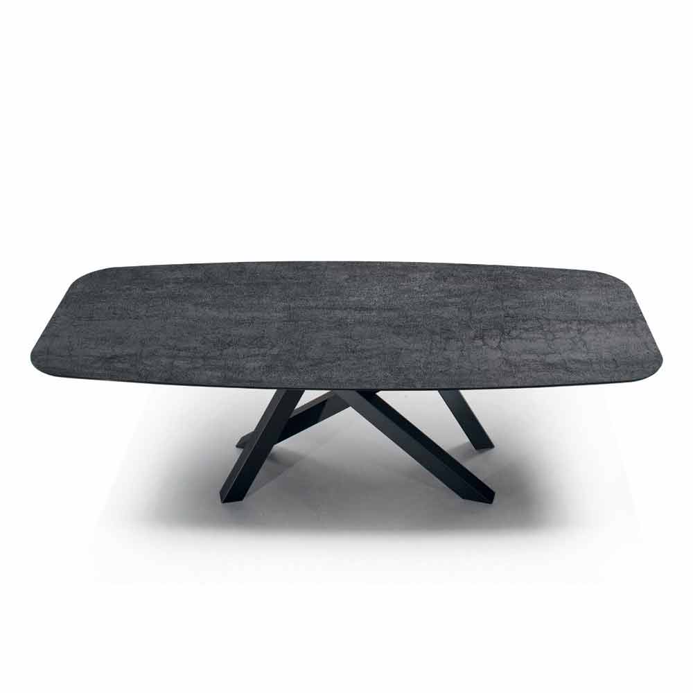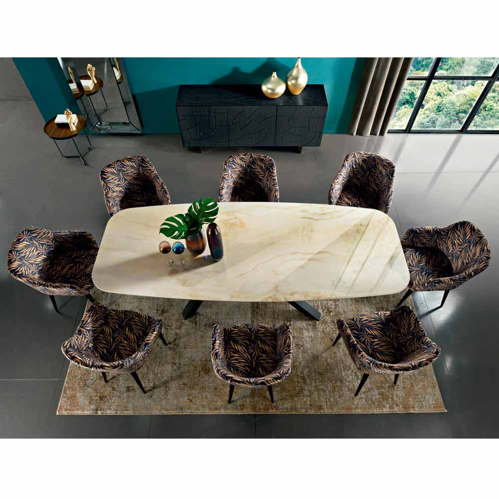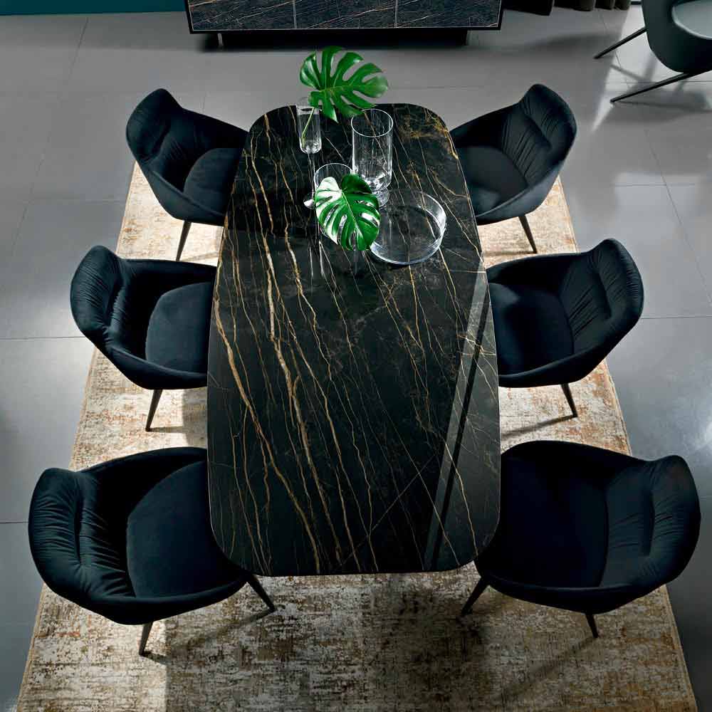 Dining table with barrel-shaped top in ceramic made in Italy, luxury.