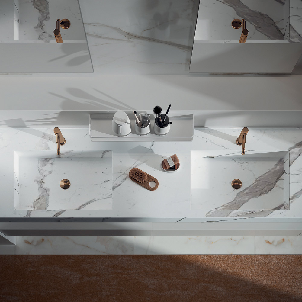 Double bathroom composition with double rectangular glass mirror , glossy white scratch-resistant melamine base with three drawers with soft closing and HPL box top with integrated double calacatta-coloured basin .