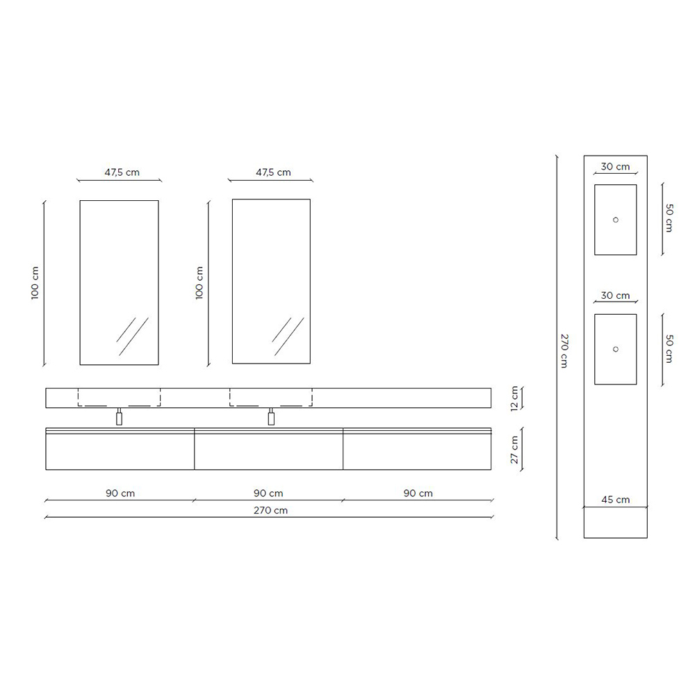 Base x3: L 270cm x H 27cm x D 45cm