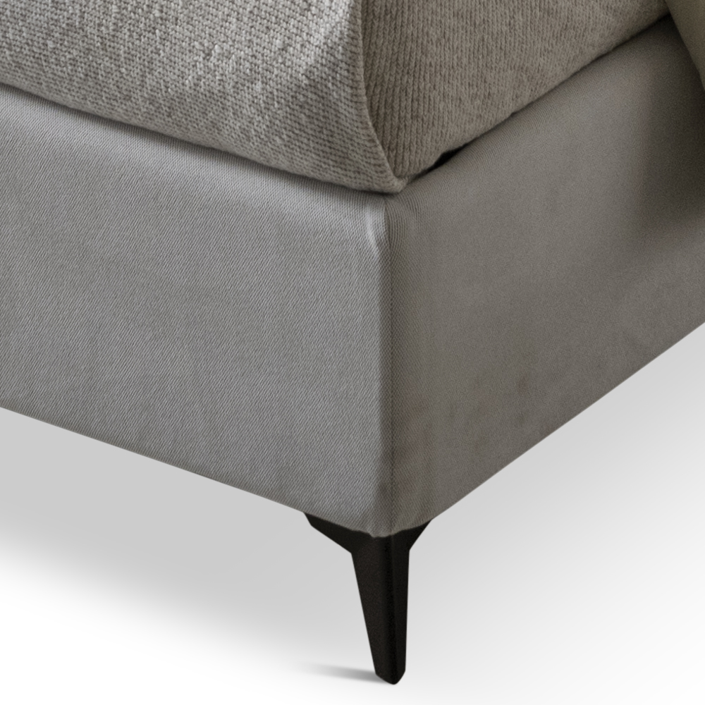 Double bed covered in water-repellent and stain-resistant fabric with dynamic base , storage box and anthracite-finish metal feet (height 13.5 cm).