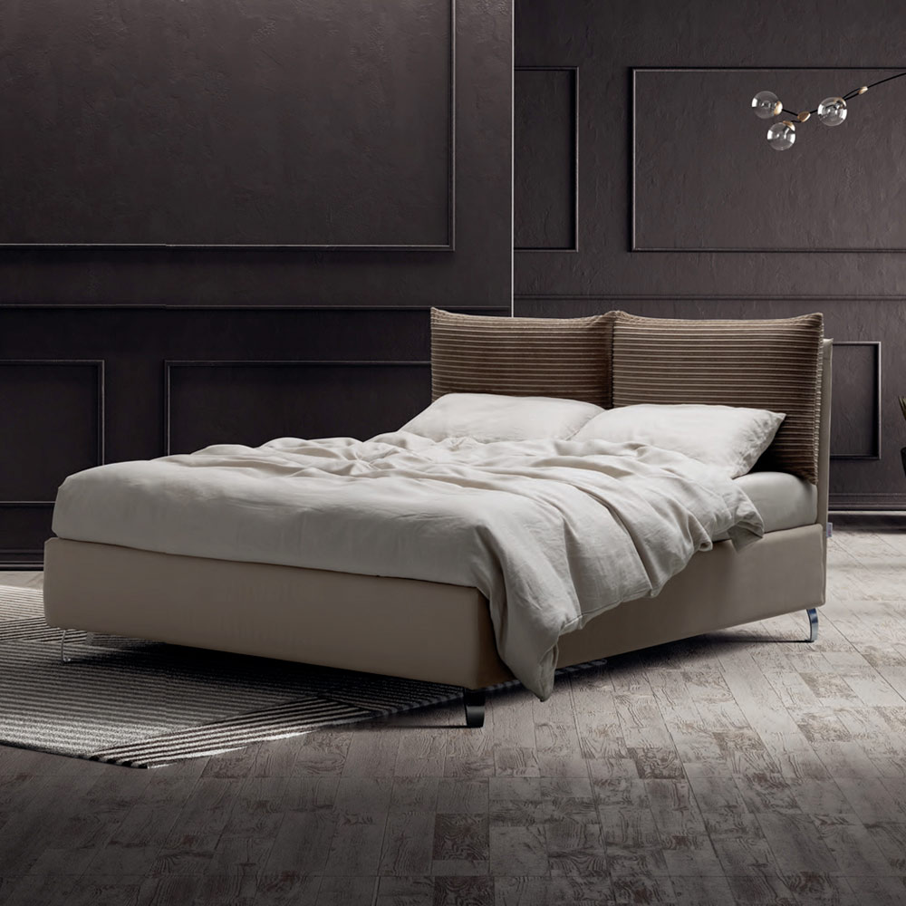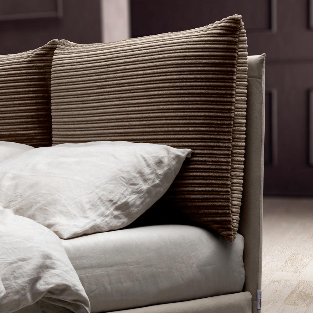 storage box, metal feet with polished steel finish (height 12 cm) and headboard made with two soft cushions in eco-friendly and green fabric, in contrast to the bed in water-repellent fabric. The cushions are fixed to the frame with practical adhesive Velcro inserts that allow for convenient and easy removal.