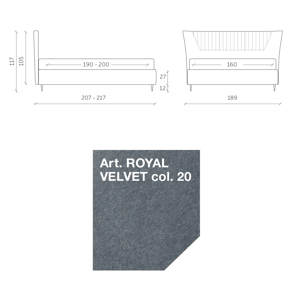storage box, metal feet with polished steel finish (height 12 cm) and headboard with a particular and innovative design: the sides have curved lines and the central part of the headboard is made with quilted inserts with wide vertical slats in fireproof fabric.