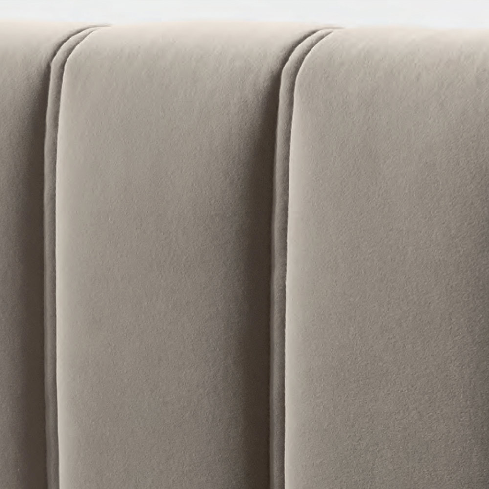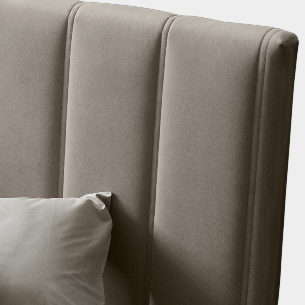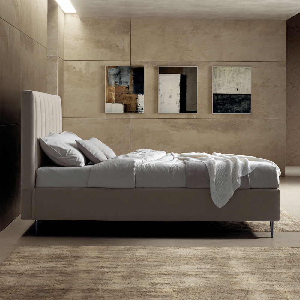 storage box, mocha finish metal feet (height 15 cm) and thick headboard in fireproof fabric, made with a particular quilting process with wide vertical bands that highlights the rigor and clean lines.