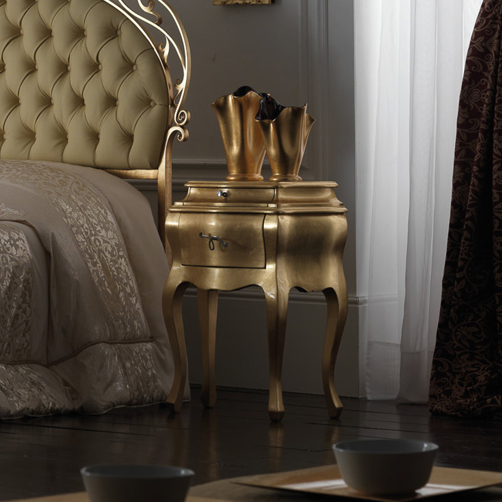 • gold leaf bed, gold bedside tables