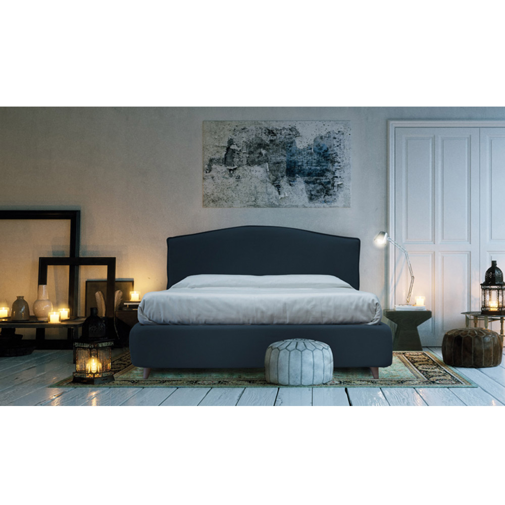 Double bed made with medium density wood fiber panel (MDF) structure and covered in blue fabric with dove gray polypropylene feet.