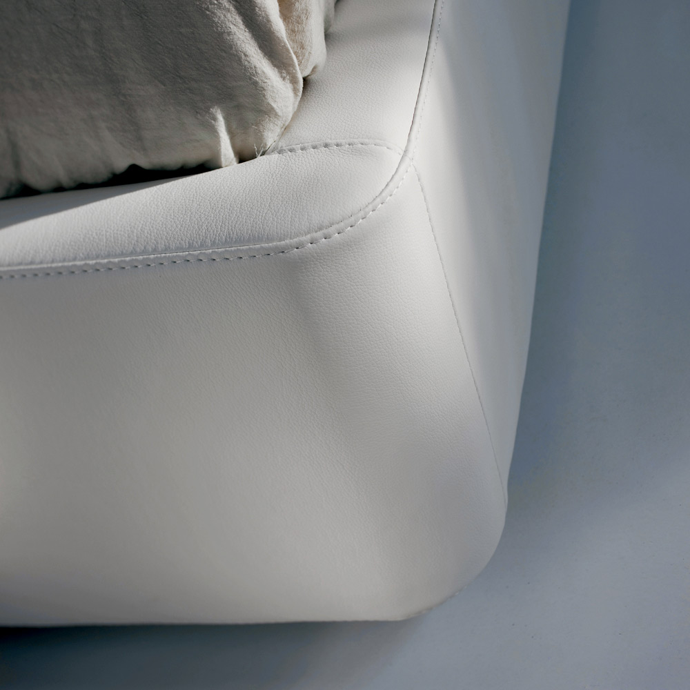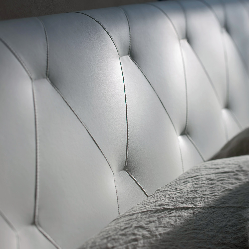 The bed is a masterpiece of modern design that promises both aesthetics and comfort. Its geometric padded headboard is a focal point, offering comfortable support and adding a dimension of contemporary style to the room. The sturdy frame of the bed ensures durability, while the high-quality faux leather upholstery emphasizes the elegant look. The thin and refined legs complete the design, giving the bed a modern and sophisticated presence. It is the ideal choice for those who want a touch of modernity combined with comfort in their bedroom.